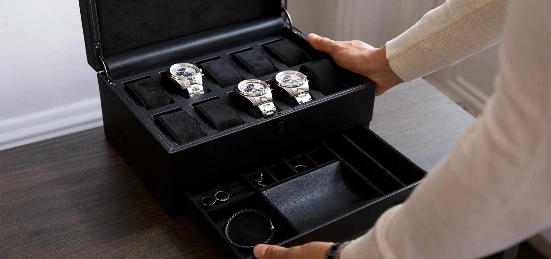 Each winder is handcrafted with premium materials including fine leathers, exotic woods, and precision-engineered components.