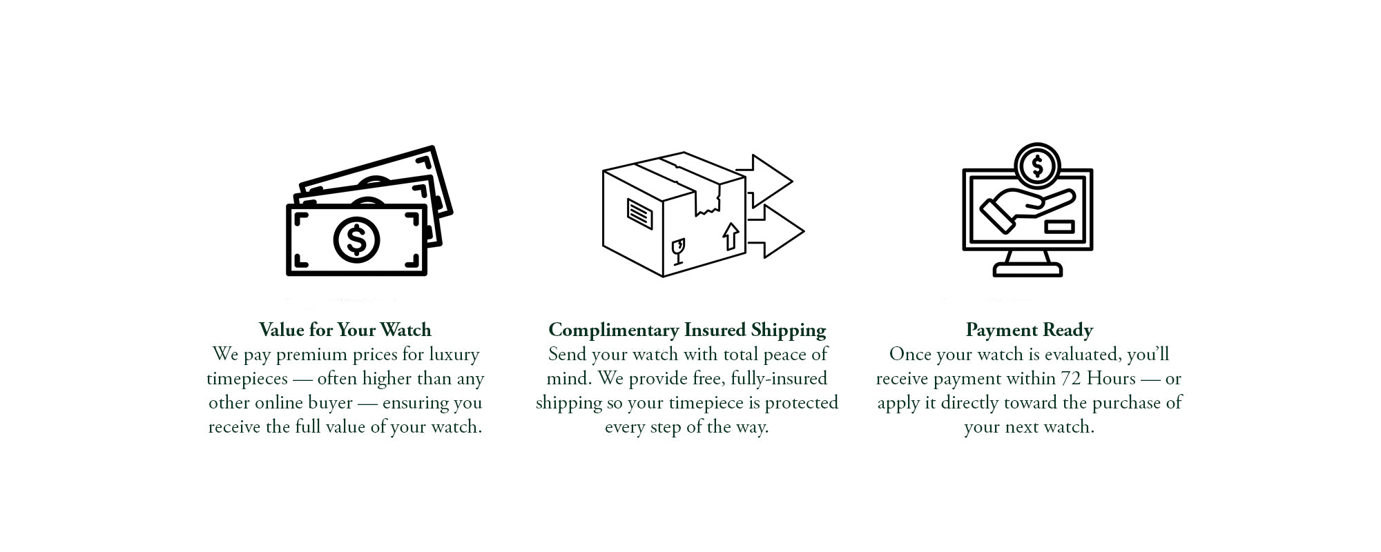 Once you accept, we will provide you with a secure and fully insured shipping label. After your watch arrives, our team will complete an authentication and service inspection, which typically takes about five business days. Once everything is approved, your payment will be issued promptly.