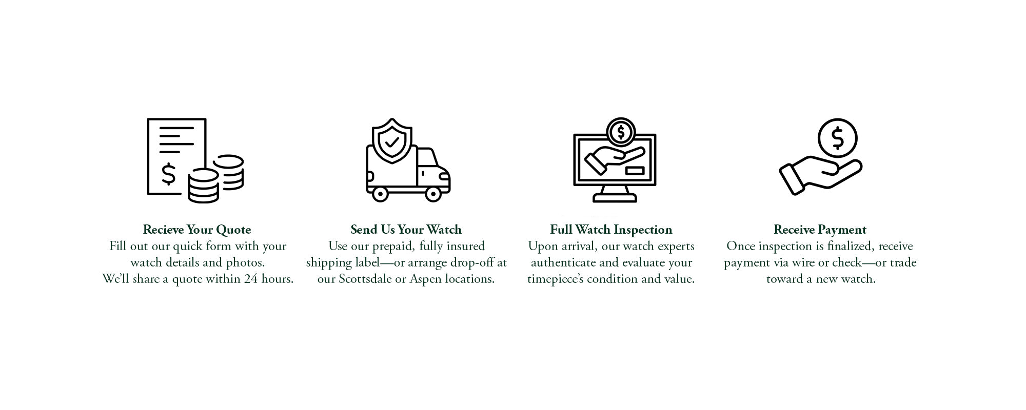 Once you accept, we will provide you with a secure and fully insured shipping label. After your watch arrives, our team will complete an authentication and service inspection, which typically takes about five business days. Once everything is approved, your payment will be issued promptly.