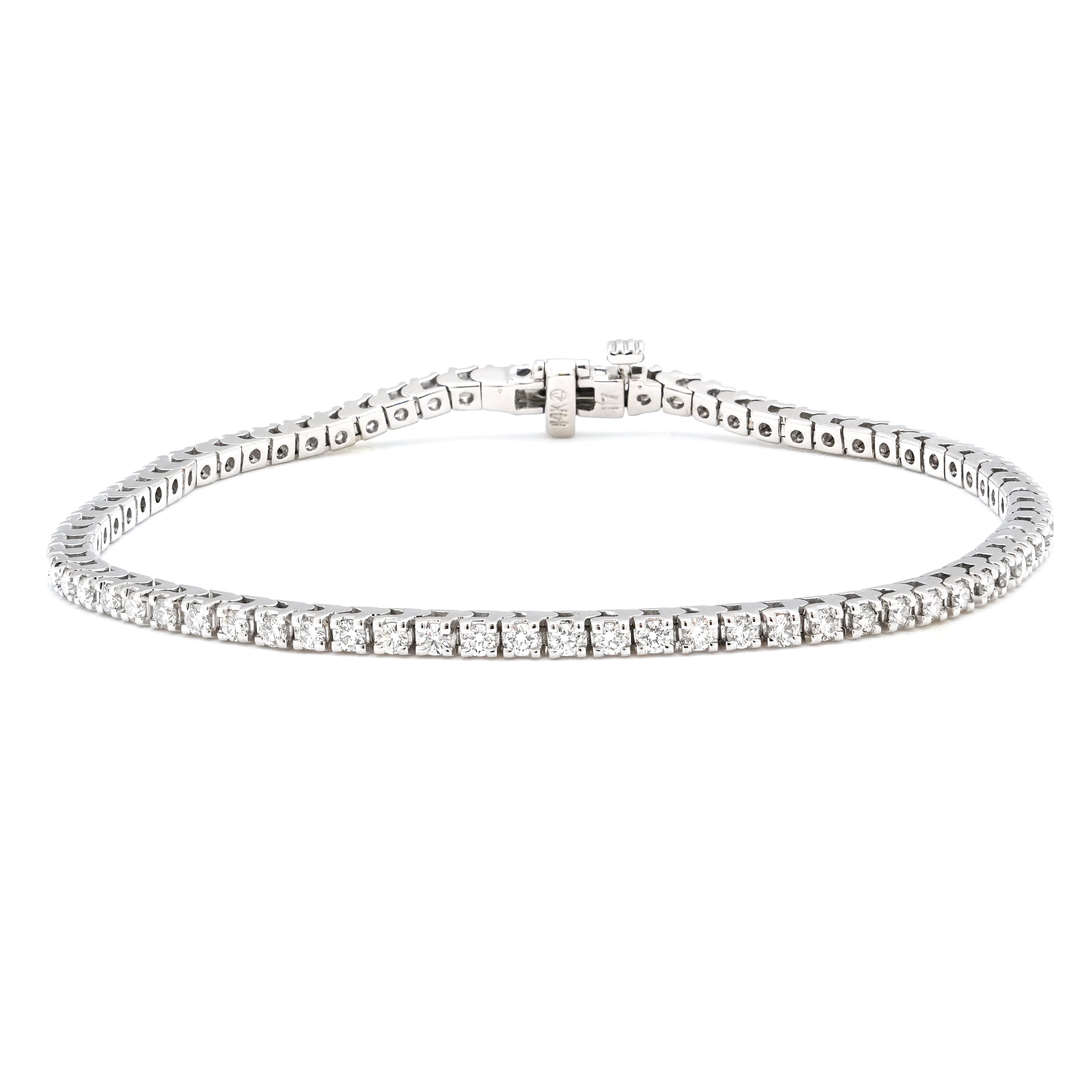 At Oliver Smith Jeweler, we have perfected the diamond tennis bracelet with ideal cut, color, and clarity. Our VS to SI clarity and F to G color diamonds offer exceptional beauty and value. Each triple-excellent cut diamond ensures maximum sparkle. We go above the industry standard when selecting stones, matching for brilliance and scintillation—not only for size and grade. Our diamond tennis bracelets are set in a four-prong basket setting, which is ideal for protecting the diamonds and showcasing their beauty. Each bracelet is hand-set by our master jewelers.