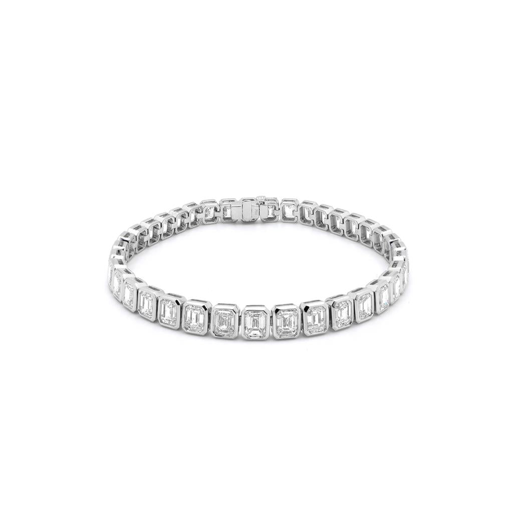 13.80Ctw Emerald Cut Diamond Tennis Bracelet With Thirty Seven Natural Emerald Cut Diamonds (F/G, Vs1) Bezel Set In 18 Karat White Gold, 7 Inches