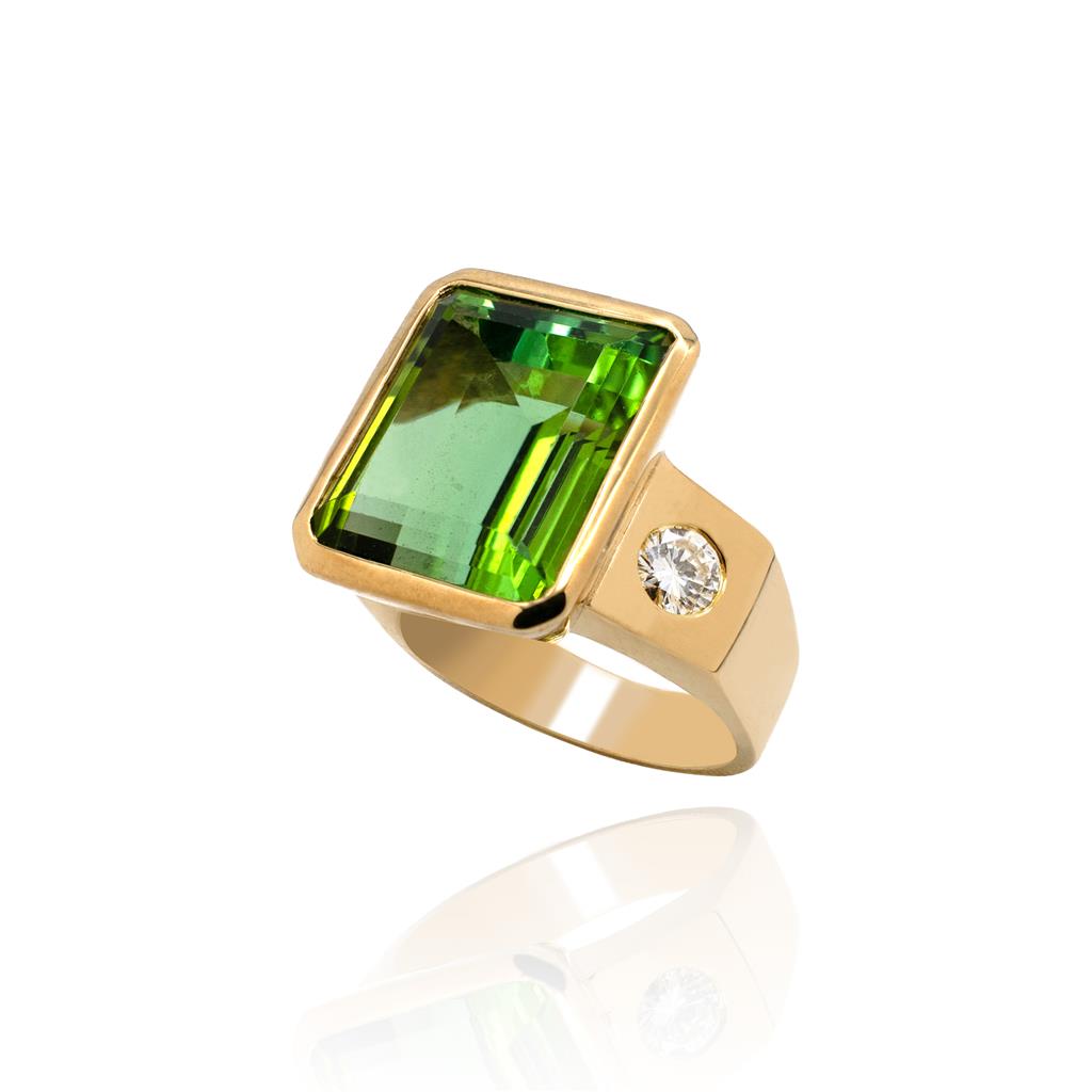 14.47Ct Green Tourmaline Gemstone Set In A Heavy 18Kyg Yellow Gold Bezel With A Flush Set Round Diamond On Either Side Of A Wide Contemporary Band With A Bright Polish Finish.