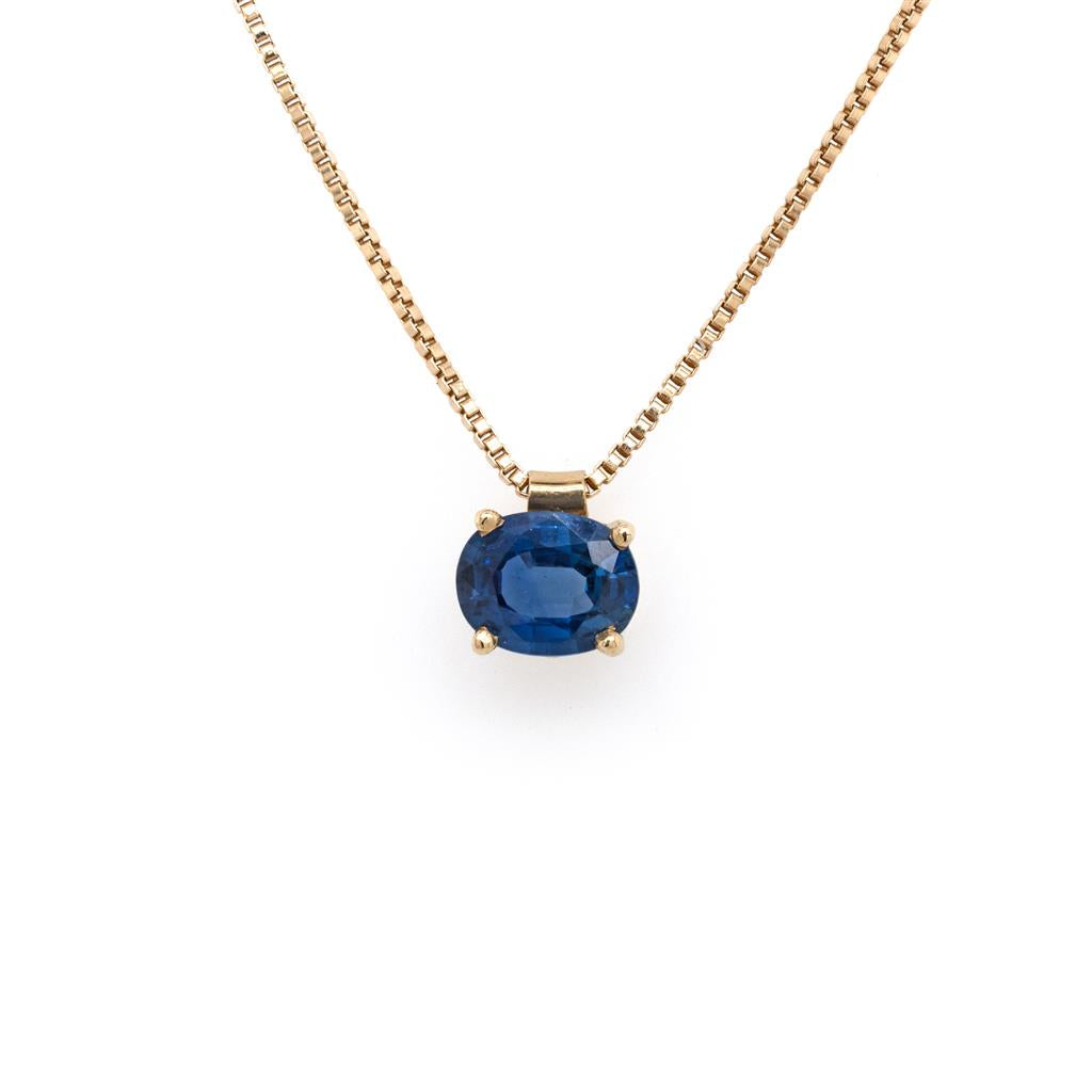 14 K yellow gold Sapphire pendant. Pendant contains one oval shaped transparent very lightly included medium dank "Royal" blue Ceylon sapphire measuring approximately 8.59 x 6.79 x3.65 mm, actual weight of 1.94 carats. Attached is a 14 K yellow gold 18 Inch box chain.
