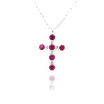 Diamond and Ruby Cross with five round brilliant cut diamonds (.67ctw, VS, F) and six cushion cut rubies (2.52ctw) set in 14 karat white gold. Chain not included.