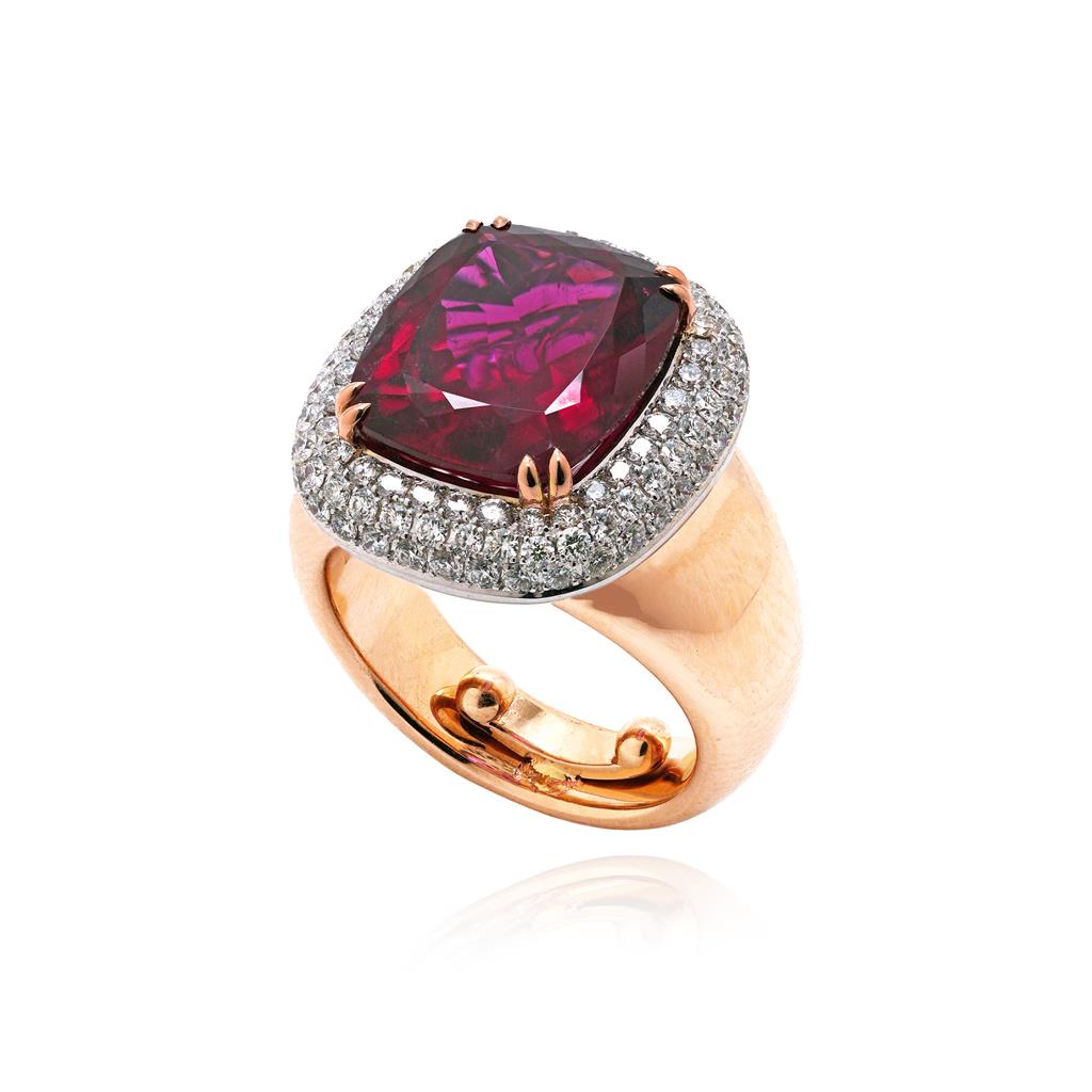 Lady's Rose Gold 18 Karat Halo Fashion Ring Size 4.5 With One = 8.83Ct Cushion 26 Tourmaline And 104 = 1.22Tw Round Brilliant G/H Vs1 Diamonds