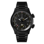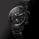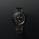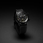 Available with a matt black DLC titanium bracelet with quick-release functionality, or a textured black leather strap with box-stitch detailing.
