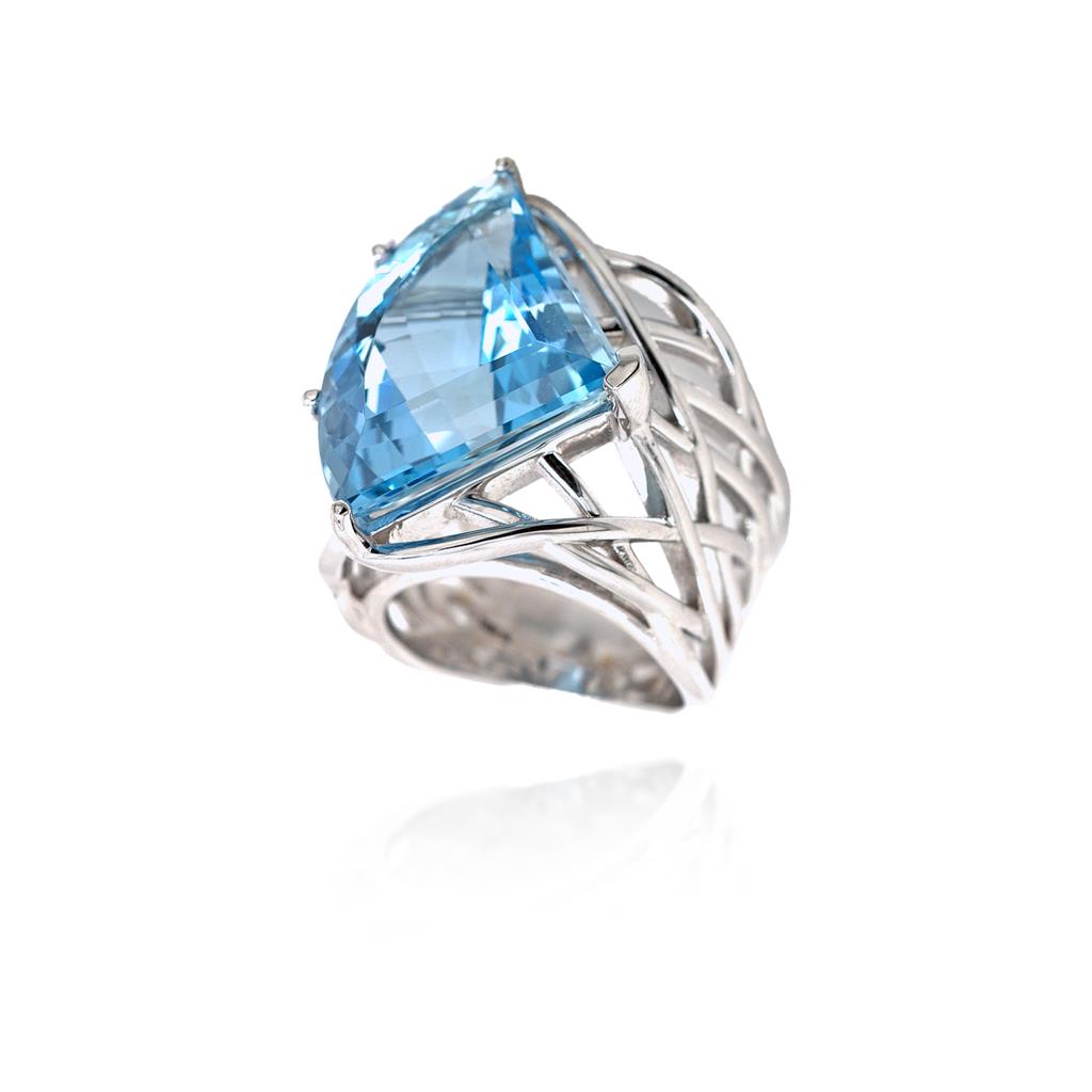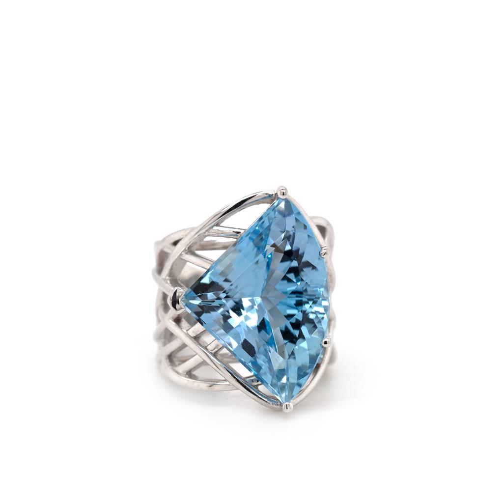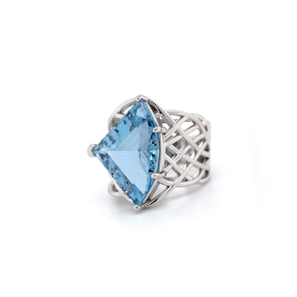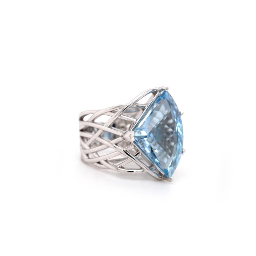 Oliver Smith Prism Collection Weave Ring with one Aquamarine (16.36ctw) set in 18 karat white gold with a weave design profile.