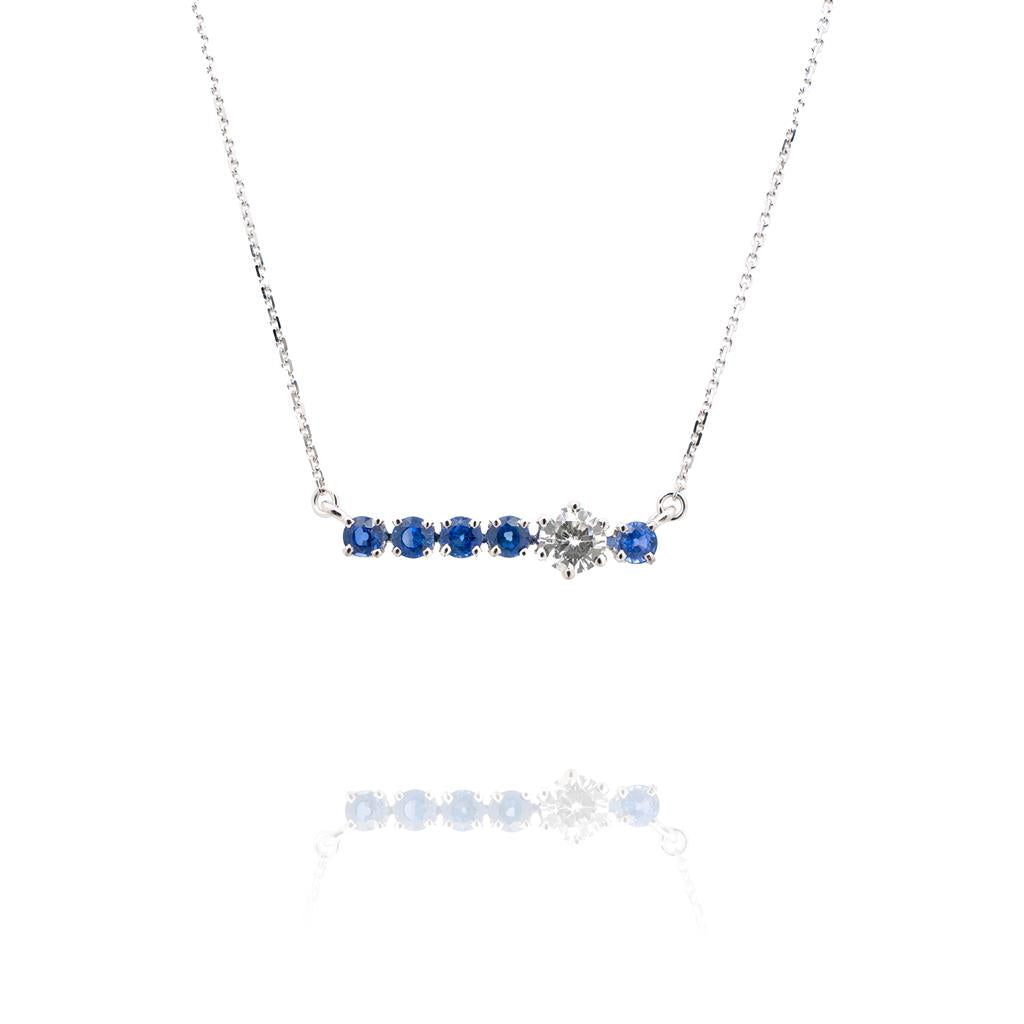 Bar Necklace With Five Blue Sapphires (1.23Ctw) And One Round Brilliant Cut Diamond (.55Cts, F/G, Vs) Four Prong Set In 14 Karat White Gold On A 1.02Mm Diamond Cut Cable Chain, 18 Inches Long