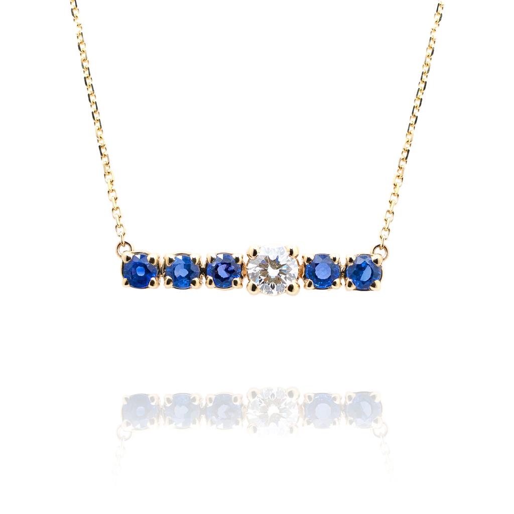 Bar Necklace With Five Blue Sapphires (1.23Ctw) And One Round Brilliant Cut Diamond (.55Cts, F/G, Vs) Four Prong Set In 14 Karat White Gold On A 1.02Mm Diamond Cut Cable Chain, 18 Inches Long