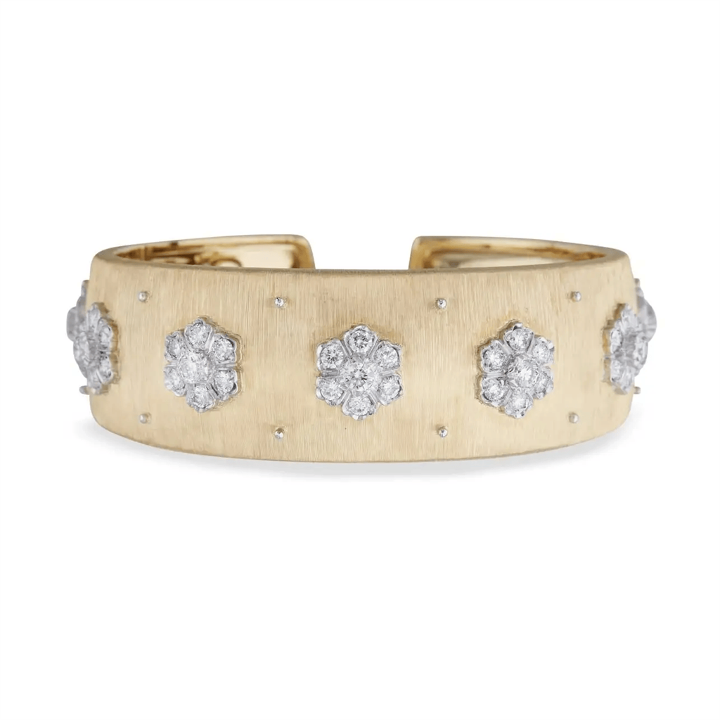 Cuff bracelet with convex band in yellow gold, engraved in ""rigato"", with floral elements from petals in white gold with diamonds and, in the center, a bezel in white gold molded leaf with a diamond. 49 round brilliant-cut diamonds 2.68 carats. "