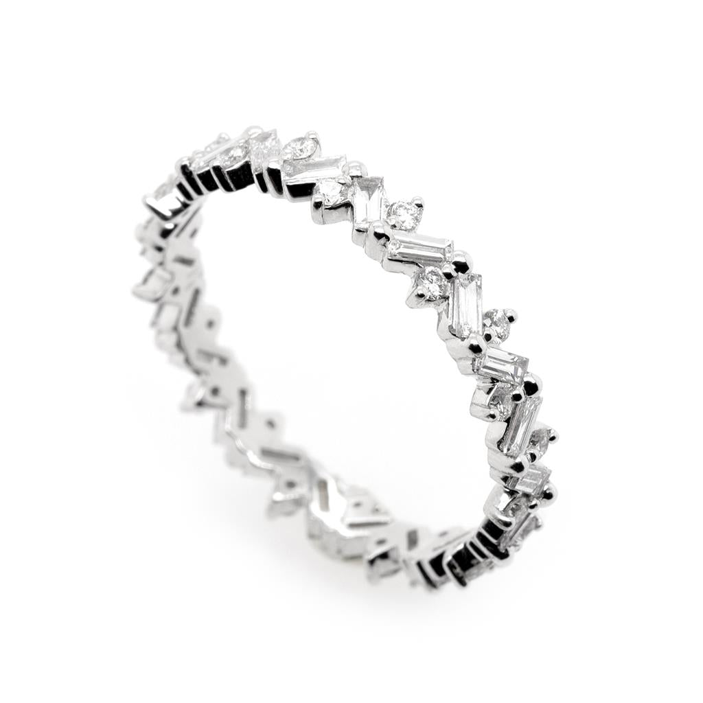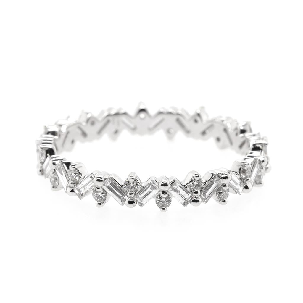 Oliver Smith Cairn Petite White Gold Eternity Band with forty four round brilliant and baguette cut diamonds (.60ctw, G/H, SI) set in 18 karat white gold. Size 5.5