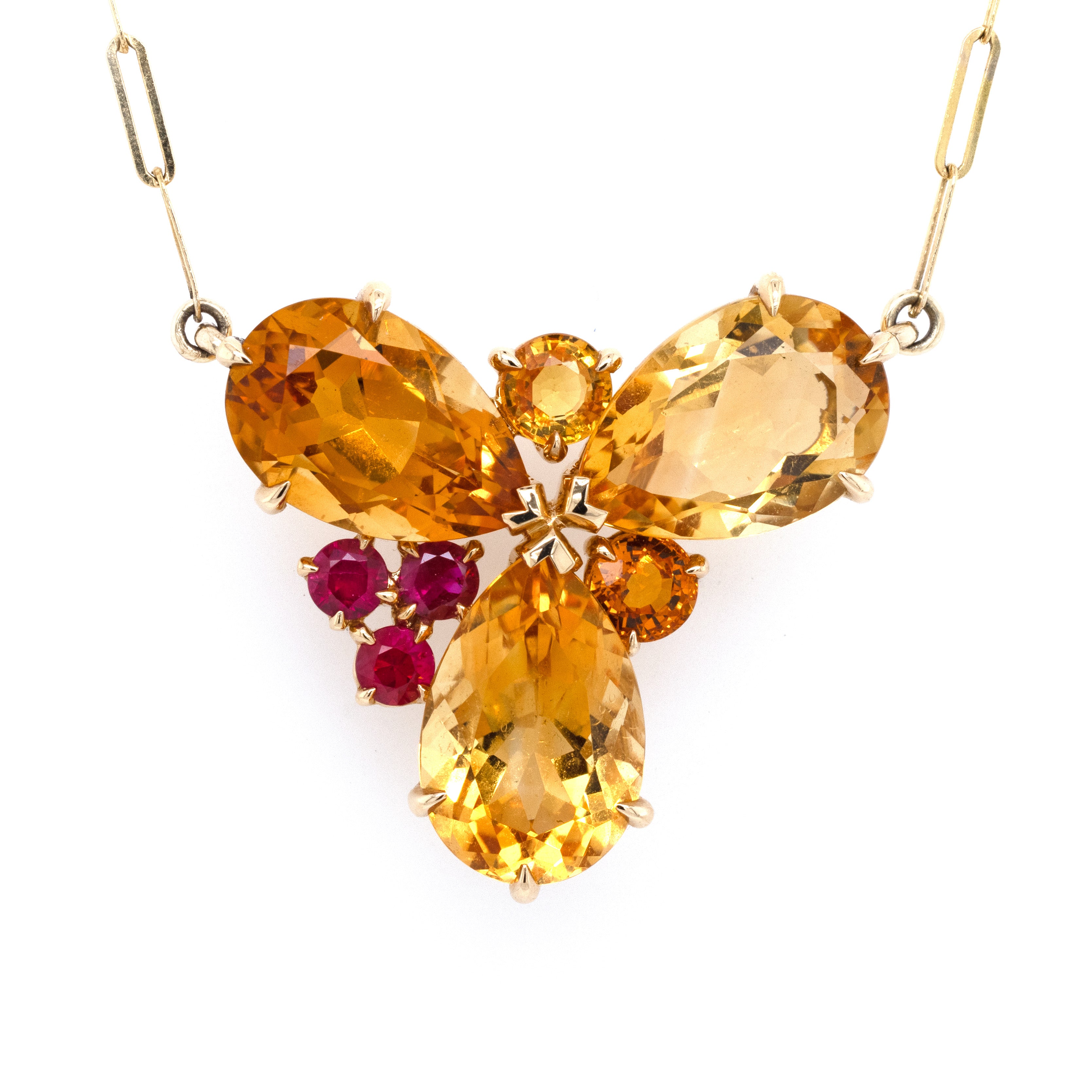 Oliver Smith Prism cluster necklace in 18k yellow gold with a center cluster element formed of 3 prong set citrine pear shape totaling in 16.16ctw, 2 orange round sapphires totaling in 1.40ctw, 3 round rubies totaling in .63ctw on at 14k yellow gold paper clip chain at 16 inches