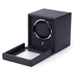 Wolf Winder. Cub Winder with cover in vegan leather with chrome finished hardware. Navy blue color. SIZE: 5.25" L X 6" W X 5.75" H. FEATURES: Rotation: 10 second start delay, 900 TPD (Turns Per Day), patented rotation programs - Intermittent rotation with pause and sleep phases pre-programmed.Directional Settings: Bi-directional. Battery Option: Option to run the unit on AC power (universal adapter included) or AA batteries - alkaline or lithium (lithium batteries will last twice as long as alkaline batteries). Batteries not included. Model # 461117.