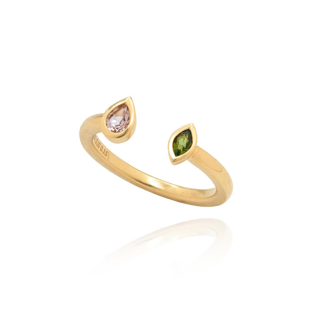 Cute Couple Ring With One Pink Pear Morganite (.15cts) And One Green Marquise Tourmaline (.10cts) Bezel Set In 18 Karat Yellow Gold, Size 6