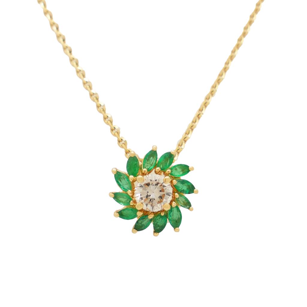 Diamond And Emerald Pendant With One Natural Round Brilliant Cut Diamond (.64Cts, H/I, Vs1) And 12 Marquise Emeralds (.65Ctw) Set In An Angled Circular Shape In 18K Yellow Gold On An 18 Inch Diamond Cut Oval Cable Chain With A Lobster Clasp. Chain Included In Price.