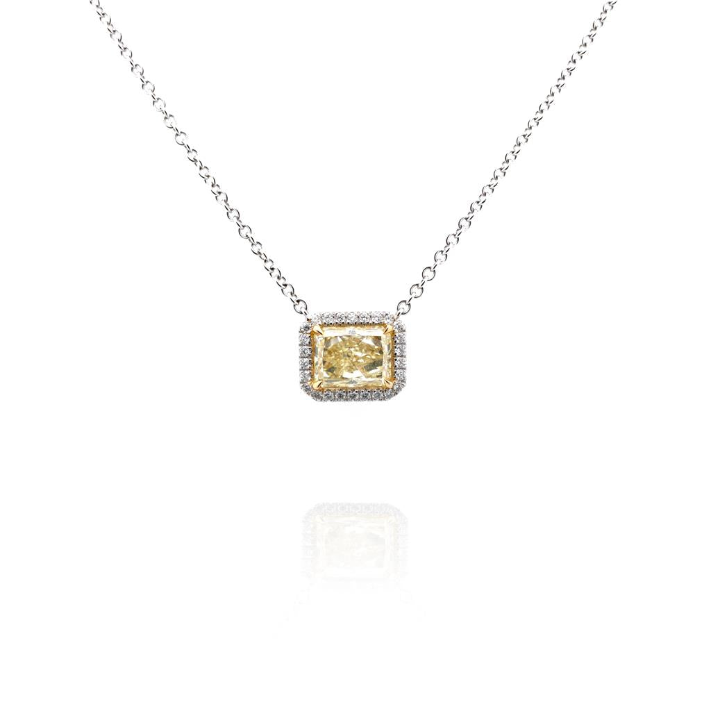 18K White Gold And Platinum Diamond Pendant. The Pendant Is Set With A Radiant Fancy Yellow Cut Diamond At 2.01 Carat, SI1 In Clarity. The Diamond Is Surrounded With A Halo Of White Diamonds At 0.15 Carats. The GIA Certification For The Center Diamond Is 6227275968