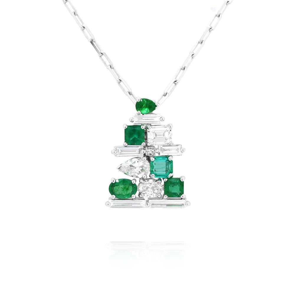 Lady's White Gold 18 Karat Free Form Pendants With 5 = 0.77Tw Various F/G Vs1 Diamonds And 3 = 0.81Tw Various Shapes Green Emeralds