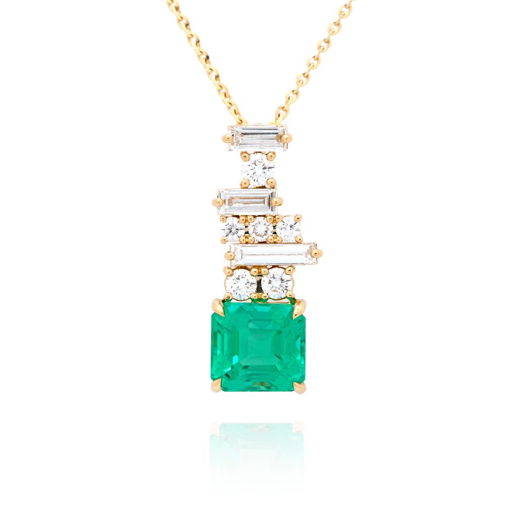 Oliver Smith Cairn Pendant In 18K Yellow Gold With Round And Straight Baguette Cut Diamonds (.79Ctw) And One Green Tourmaline (2.55Ctw).