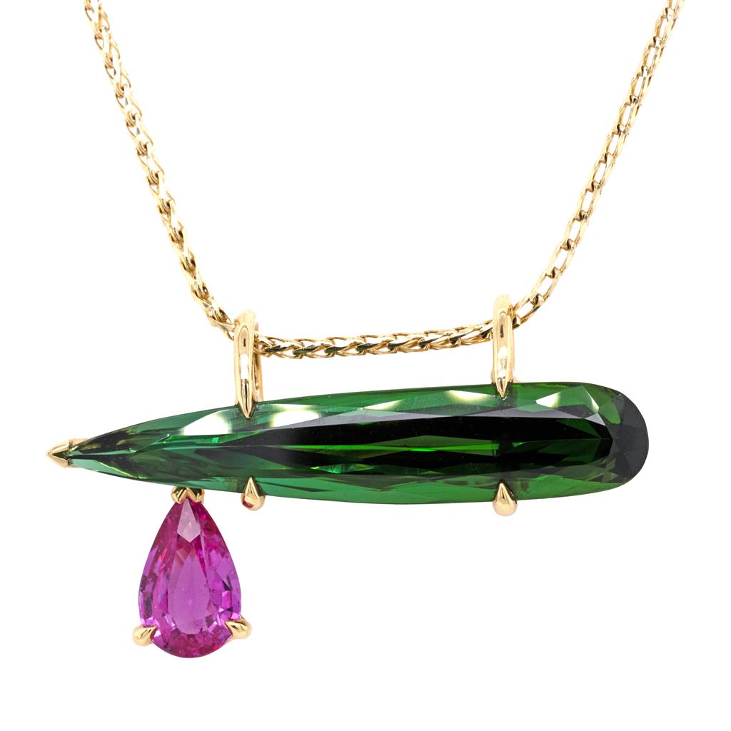 Oliver Smith Prism Collection Sapphire and Tourmaline pendant with one elongated pear cut green tourmaline (9.80cts) and one pink pear cut sapphire (1.92cts) prong set in 18 karat yellow gold.