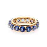Oliver Smith 14 karat rose gold eternity band with 15 shared prong set round sapphires totaling 10.63 ctw, ring has side rails so it can be worn stacked without hurting the stones, finger size 10