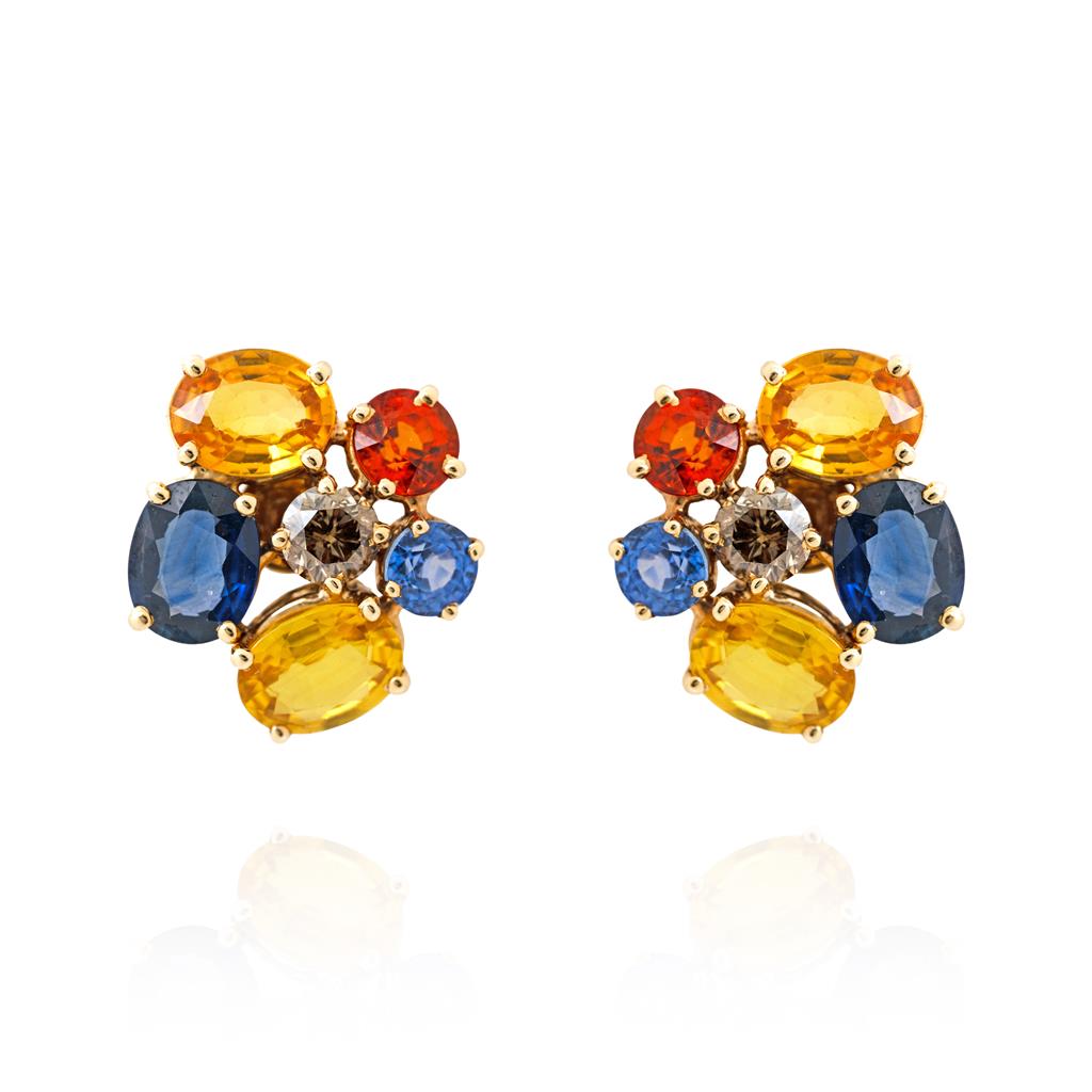 Oliver Smith 14 Karat Yellow Gold Prism Collection Earrings Formed Of A Cluster Of Basket Set Oval Blue Sapphires (2@ 3.91 Ctw) Round Fancy Brown Diamonds ( 2@ 1.31 Ctw) Round Orange Sapphires (2 @ 2.34 Ctw) Round Blue Sapphires ( 2 @ 1.78 Ctw) And Oval Yellow Sapphires ( 4 @ Approximately 7.8 Ctw) With Standard Posts And Friction Backs