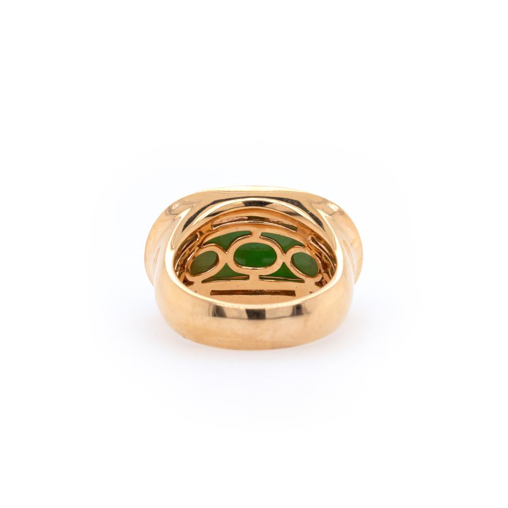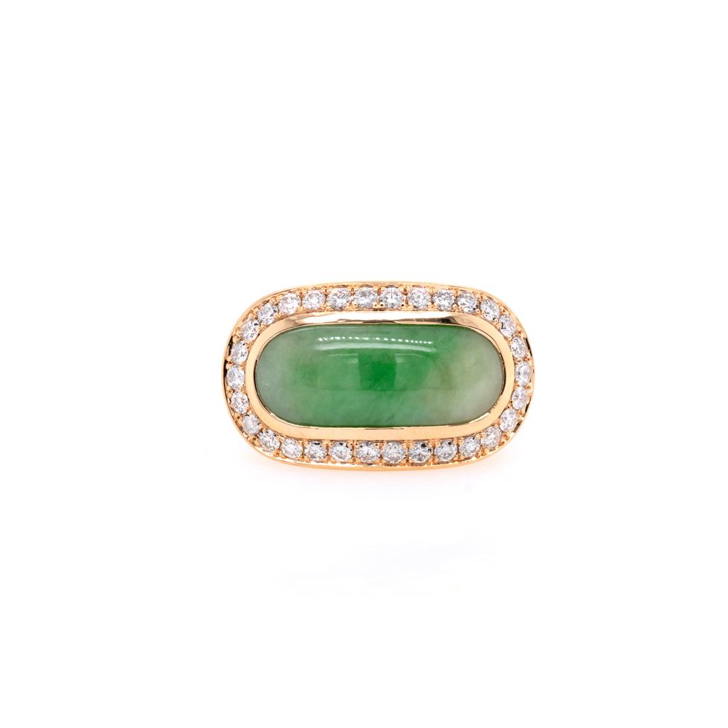 Oliver Smith 18 Karat Rose Gold Ring With A Center Bezel Set 7.68 Ct Jadeite Cabochon, Surrounded By A Halo Of Pave Set Round Brilliant Cut Diamonds 30 @ 0.74 Ctw F/G Color Vs Clarity, On Tapering Half Round Shank, High Polished Finish, Finger Size 7.
