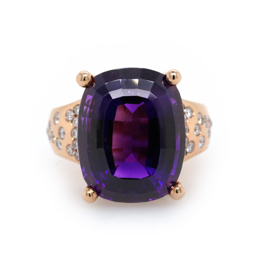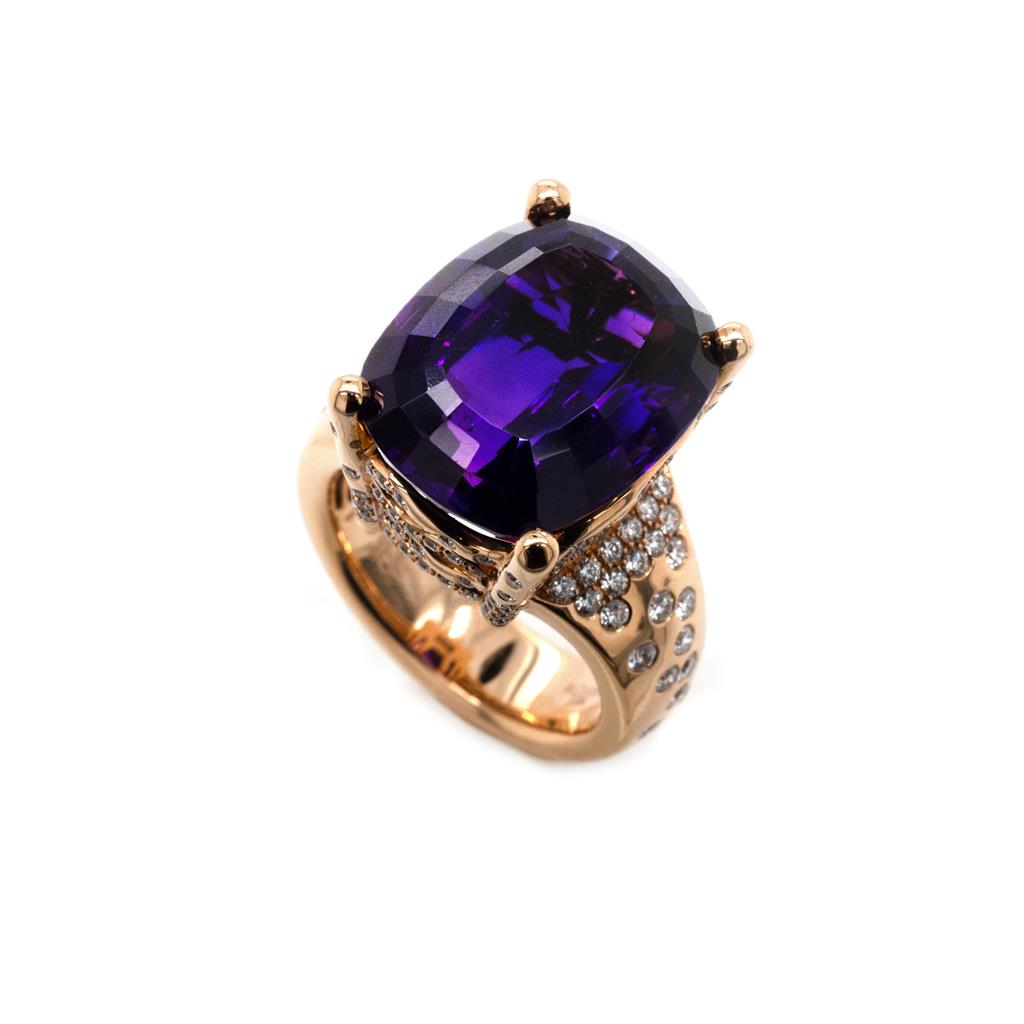 Oliver Smith 18 Karat Rose Gold 'Sea Foam' Ring With A Center 14.7 Carat Cushion Shaped Amethyst. Center Stone Held By 4 Prongs, The Basket Head And Band Have Wave-Shaped Details And Pave And Flush Set Round Brilliant Cut Diamonds Scattered To Look Like Sea Foam Falling Away From The Center Amethyst. Diamonds Total 186 At 1.3 Total Carats, F/G Color, Vs Clarity.