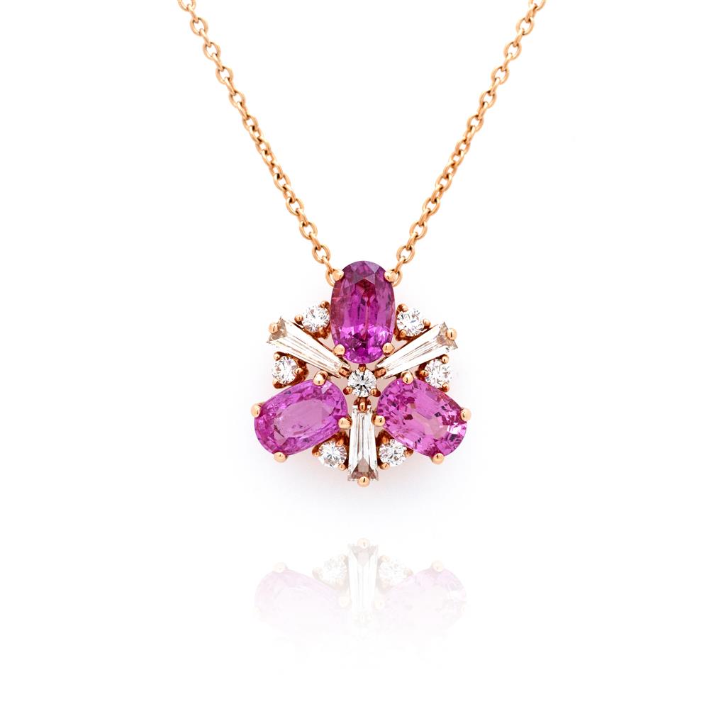 Oliver Smith 18 Karat Rose Gold Pendant With 3 Prong Set Oval Pink Sapphires @6.04 Ctw Set In A Radial Pattern With Tapered Baguette Diamonds, 3 @ 0.57Ctw F Vs And Round Brilliant Cut Diamonds 7 @ 0.44Ctw F Vs. With Hidden Bail, On 18 Inch Long 18 Karat Rose Gold Cable Link Chain With Jump Ring To Adjust To 16 Inches Long, Chain Is Included In Price