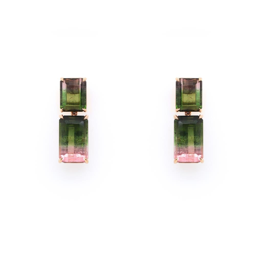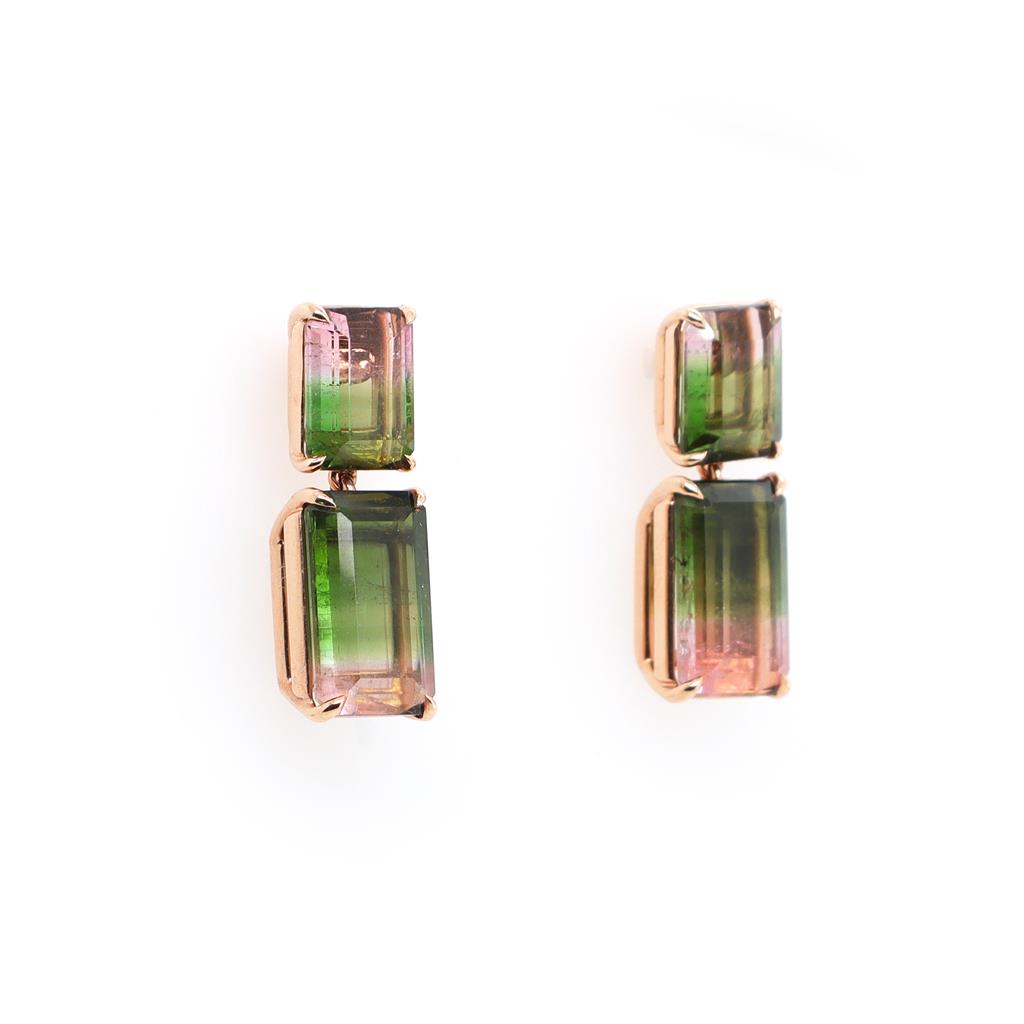 Oliver Smith 18 karat rose gold drop earrings formed of 4 emerald cut bi-color pink to green tourmalines, totaling 4 @ 14.1ctw all in basket settings with darted prongs, earrings are on standard posts with friction backs.