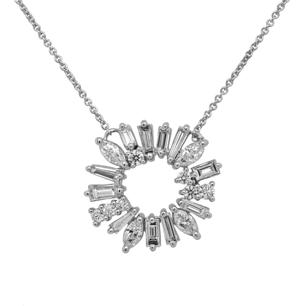 Oliver Smith 18 Karat White Gold Cairn Collection Necklace With A Circular Element Formed Of Prong Set Baguette, Marquise And Round Brilliant Cut Diamonds Totaling 17 @ 1.12Ctw F/G Color Vs Clarity, Center Element Is In The Center Of An 18 Inch Long Chain With A Just Ring At 16 Inches