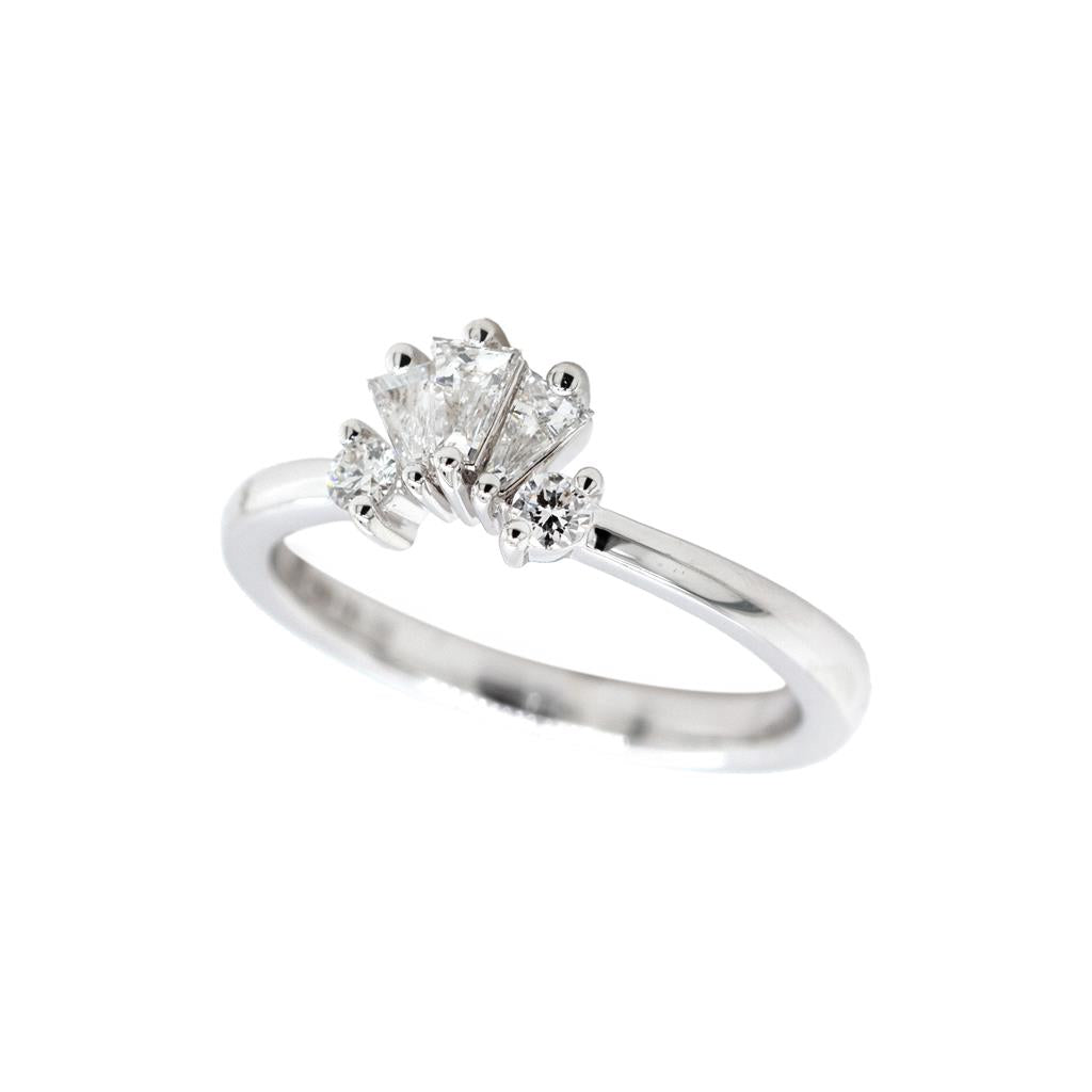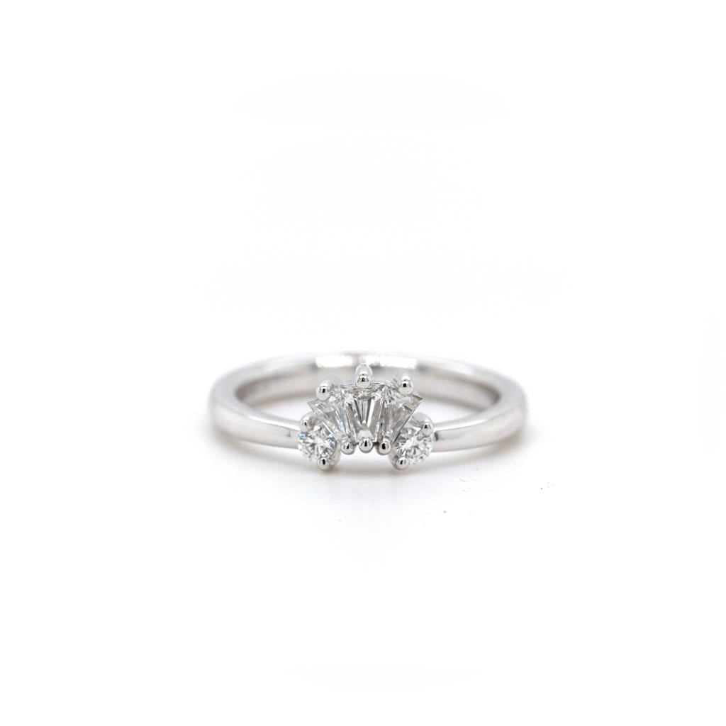 Oliver Smith 18 karat white gold Cairn collection band with a center fan of tapered baguettes flanked by two round diamonds with an indent to have another ring sit flush against the band, diamonds total 5 @ 0.4ctw, finger size 6.5