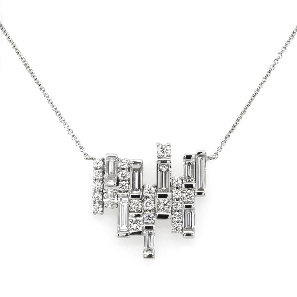 Oliver Smith 18 Karat White Gold Cairn Collection Necklace With A Center Element Of Prong And Bar Set Round, Oval And Straight Baguette Cut Diamonds Totaling 27 @ 1.98 Ctw Of F/G Color And Vs Clarity, Set In The Center Of A Cable Link Chain 18 Inches Long With Adjustable Jump Ring At 16 Inches