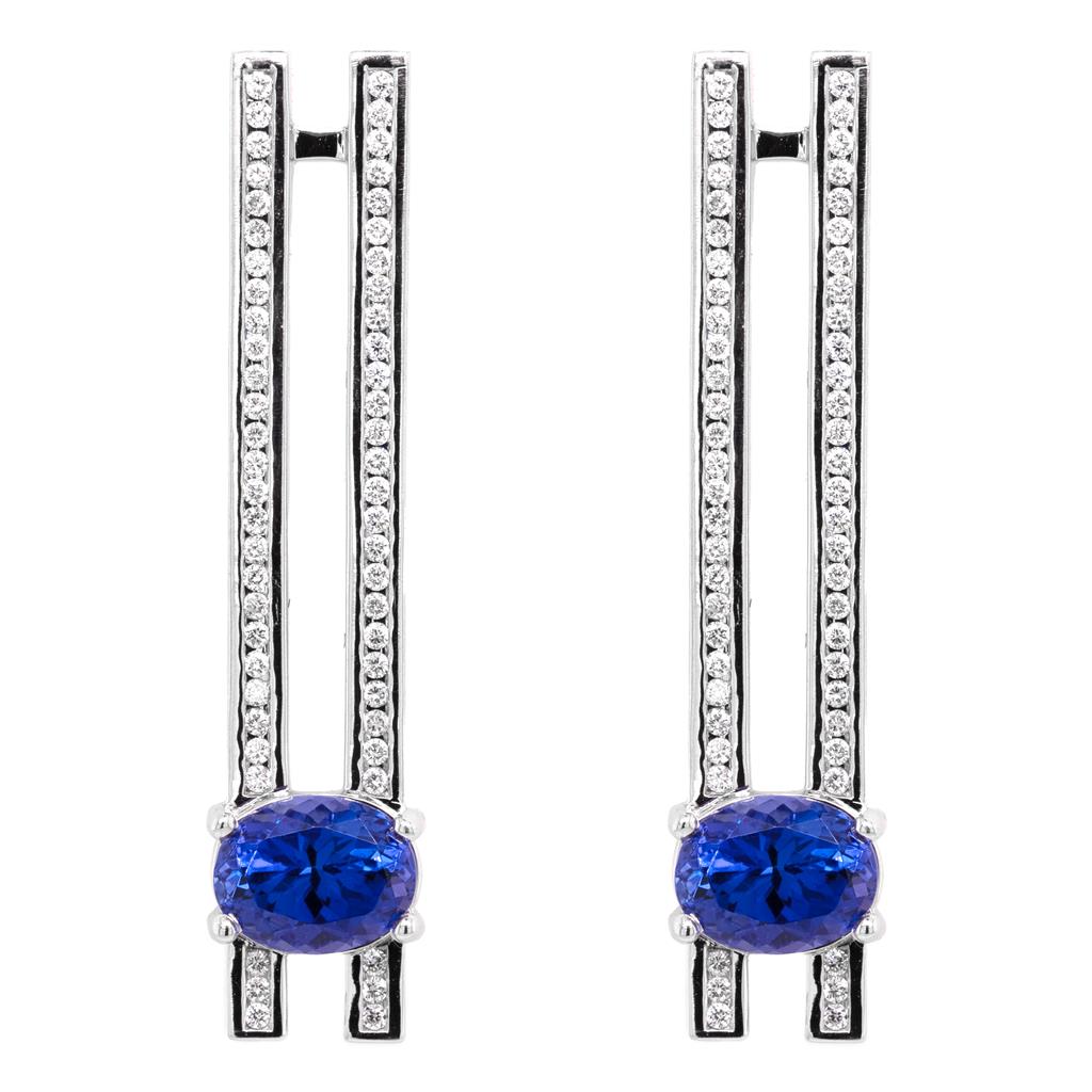 Oliver Smith 18 karat white gold earrings with 2 rows of channel set rbc diamonds on each earring (diamonds total 112 @ 0.58ctw) with prong set oval tanzanite, total 2 tanz @ 3.11 ctw, with post and friction back