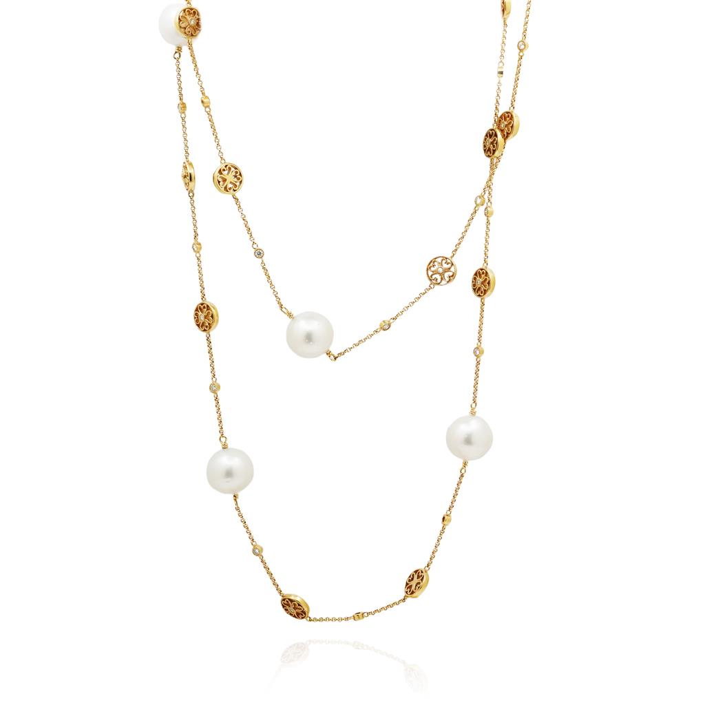 Oliver Smith 18 karat yellow gold Signature collection element chain with small filigree discs with bezel set diamond centers and 5 white South Sea pearls13.5mm , and bezel set diamonds spaced on the chain between each disc, diamonds total 34 @ 0.80 ctw H/I color VS clarity, Chain is 33 inches long with a second jump ring at 32 inches