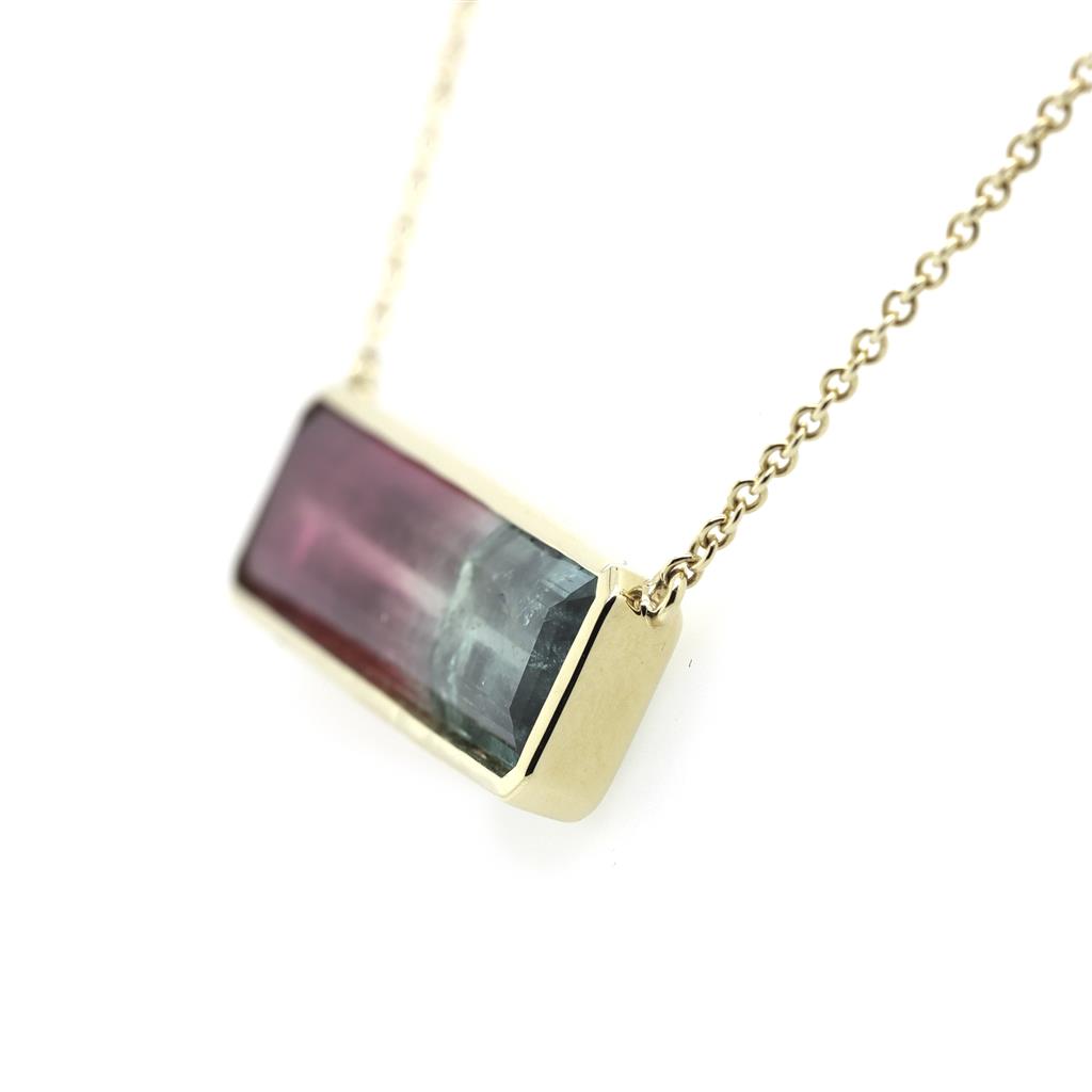 Oliver Smith 18 Karat Yellow Gold Bezel Set Bi-Color Elongated Emerald Cut Tourmaline Necklace, Tourmaline Is 9.74 Carats Pink To Green Color On Center Of 1.2Mm Cable Link Chain Adjustable From 16 To 18 Inches Long