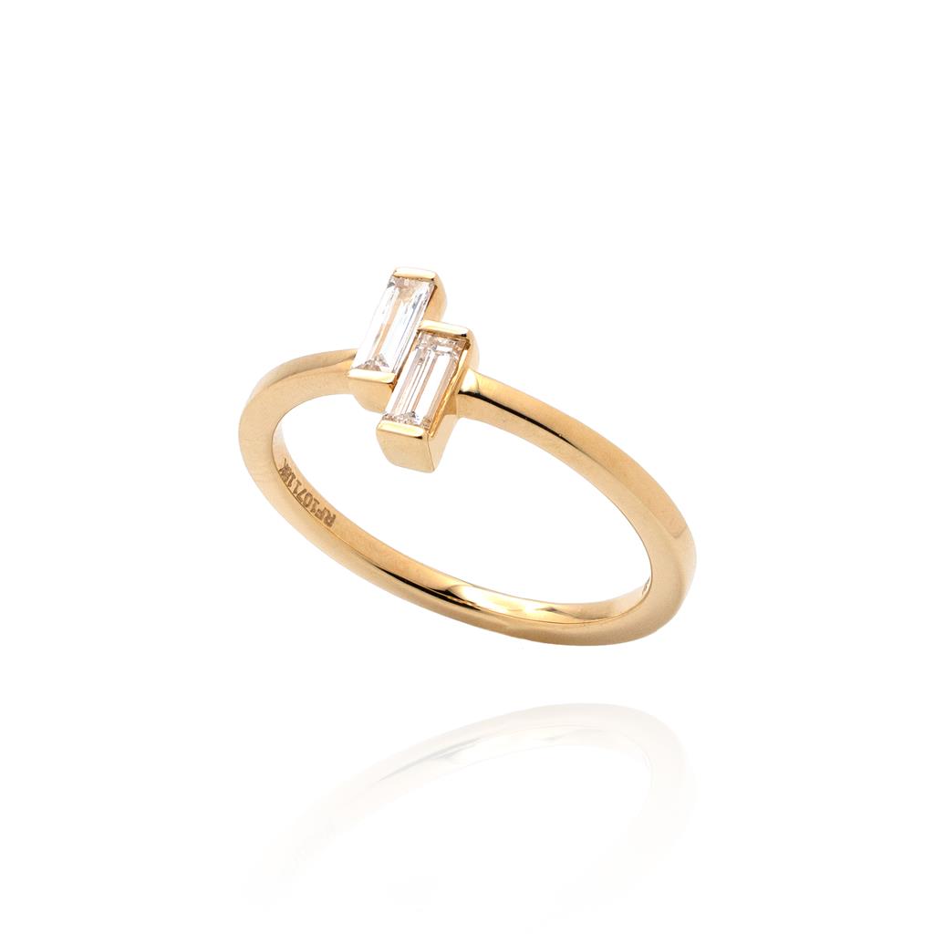 Oliver Smith Cairn Collection Stepping Stones ring with two center bar set straight baguette diamonds set in 18 karat white gold totaling 0.20 carats of F/G color and VS clarity, on 18 karat white gold flat square shank, finger size 6.5