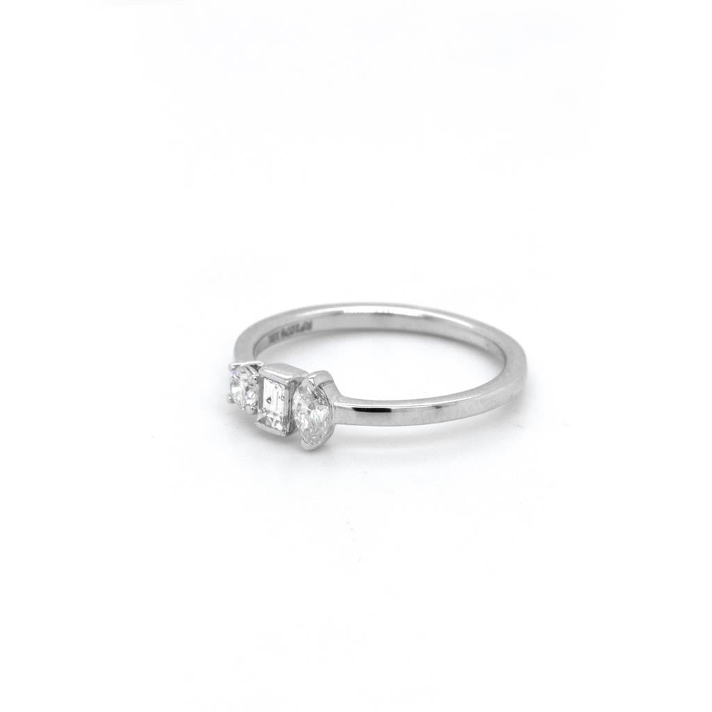 Oliver Smith Cairn ring in 18 karat white gold with one baguette cut diamond (.22ctw), one round brilliant cut diamond (.13ctw) and one marquise cut diamond (.22ctw), size 7