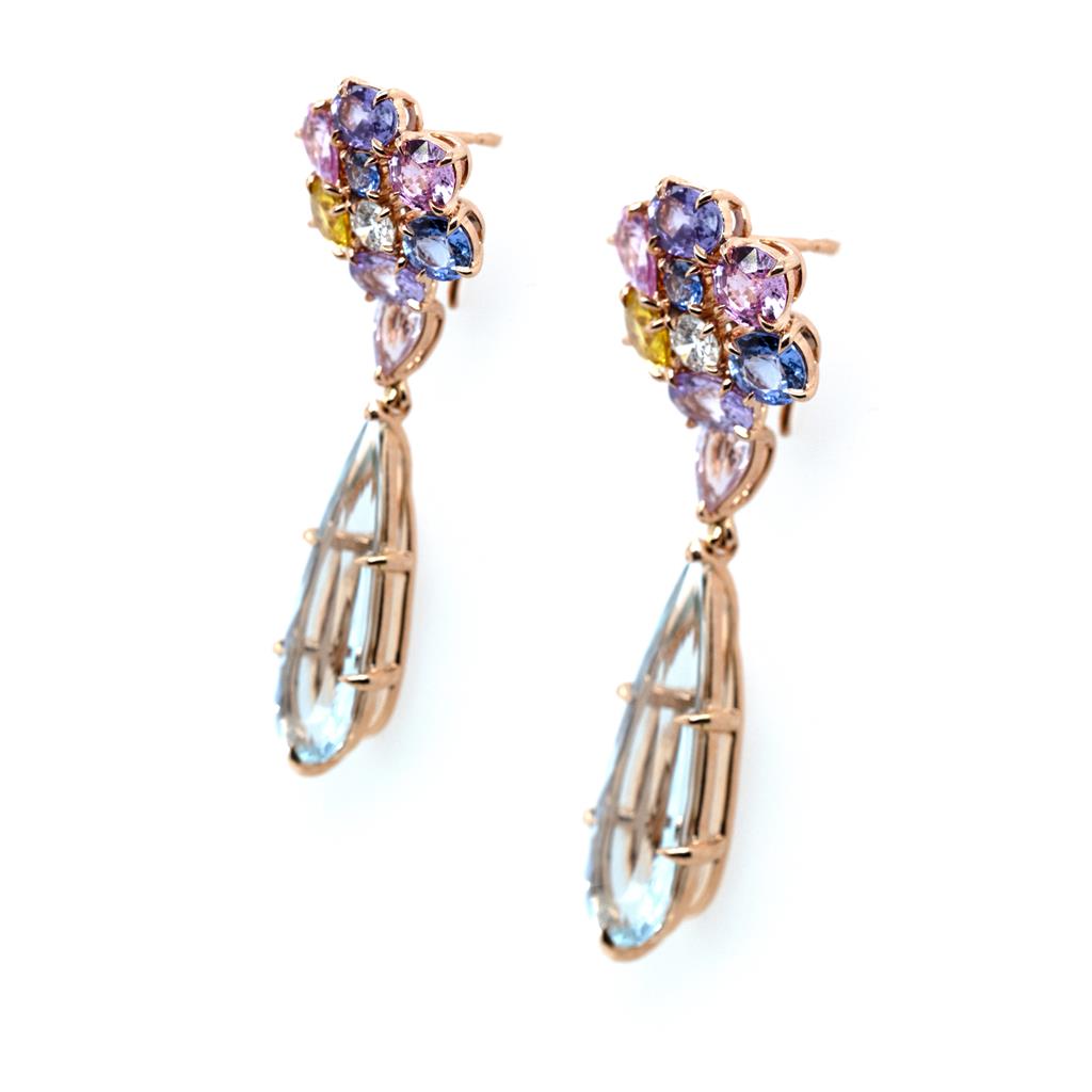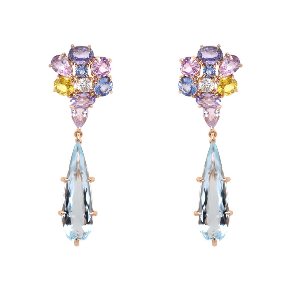 Oliver Smith Prism Floral Raindrop Earrings with two round brilliant cut diamonds .3ctw G/H, SI1, 16 various shaped and colored sapphires, and two pear shaped removable Aquamarines 8.44ctw set in 18k rose gold.