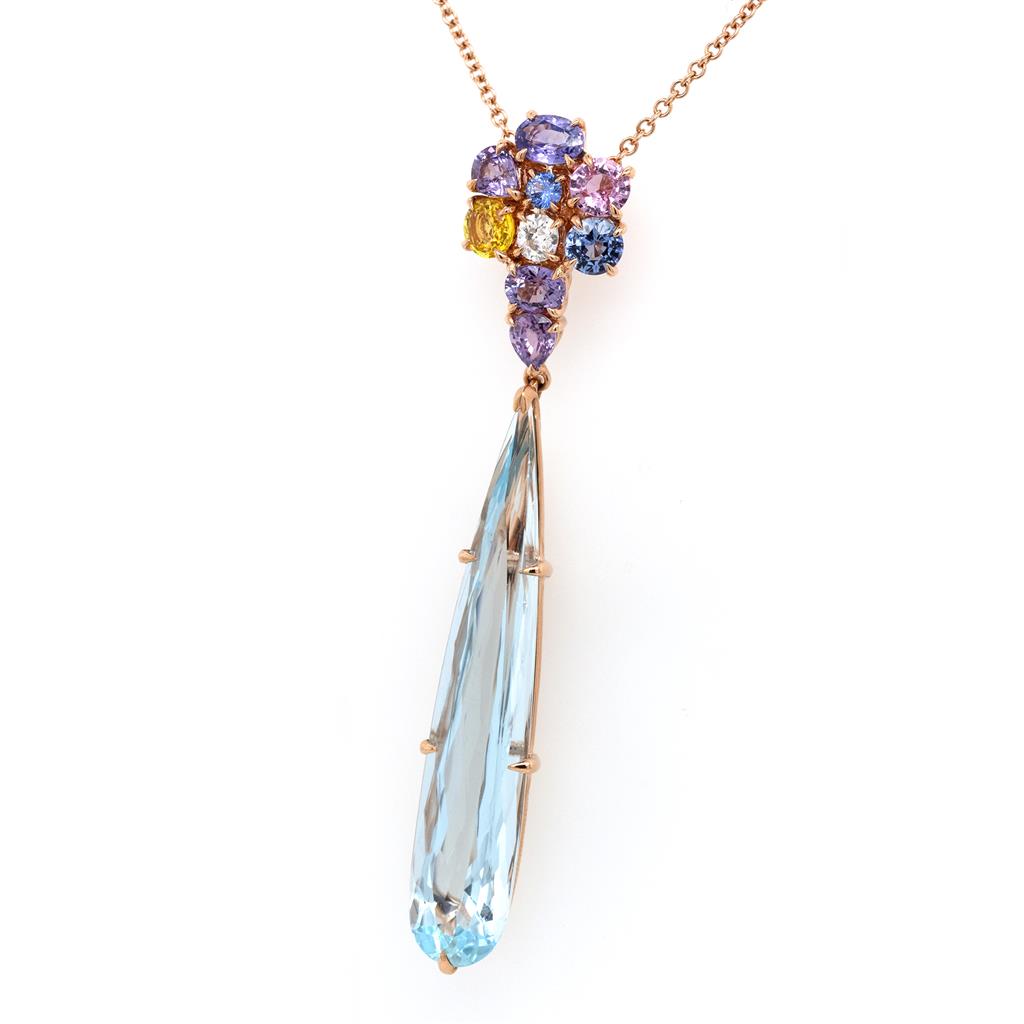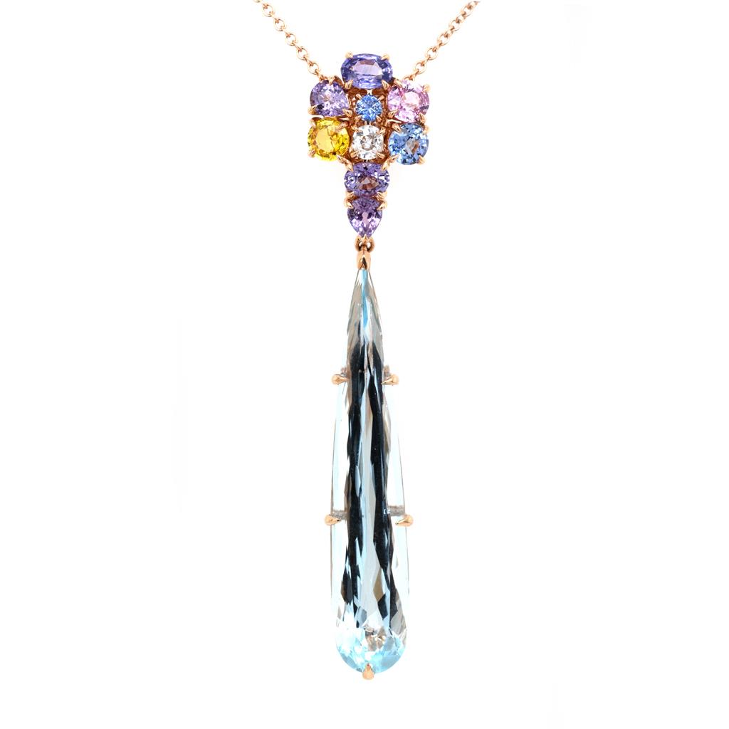 Oliver Smith Prism pendant with one .19ctw round diamond, one tear drop shaped 14.75ctw Aquamarine, and various colors and shapes sapphires set in 18k rose gold.