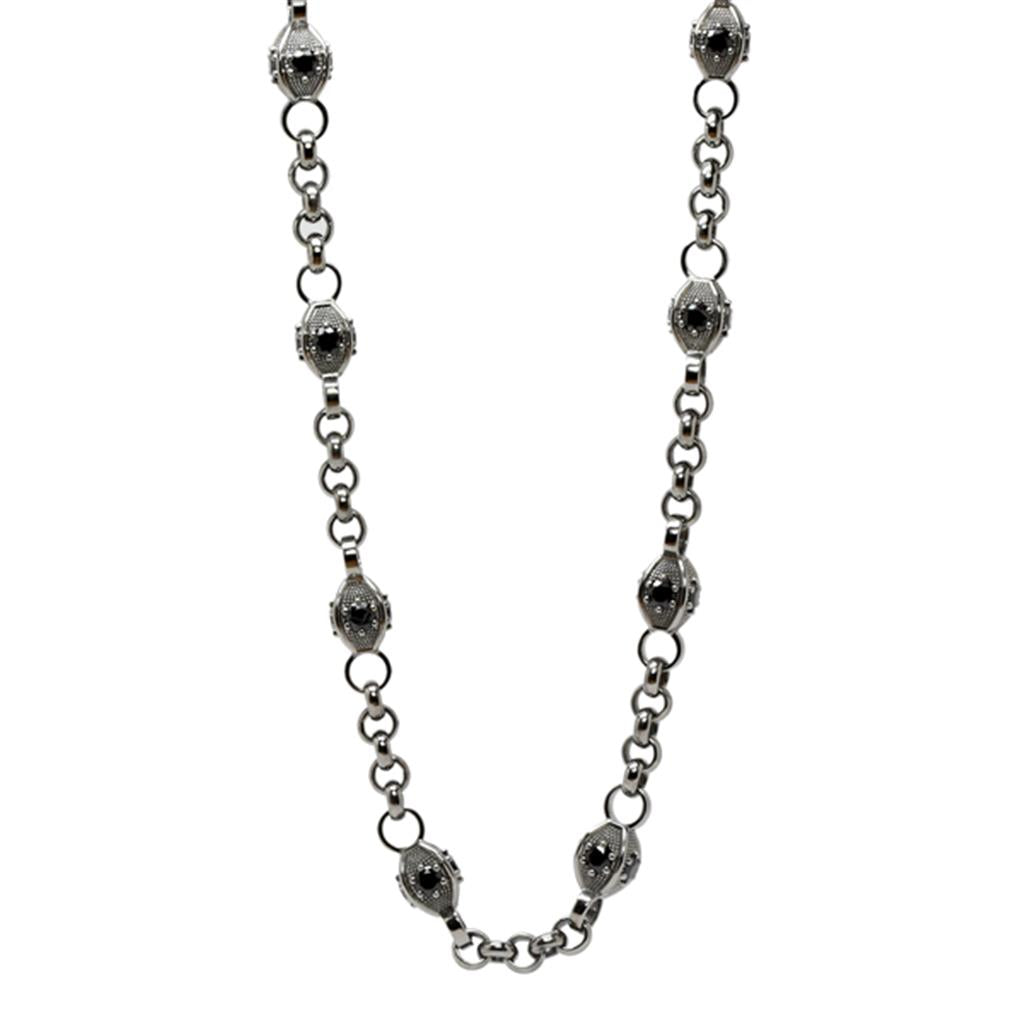 OSJ 32" Sterling Silver Stardust necklace with elements evenly spaced with on inch of 5.5mm rolo chain in-between each element. Each element is 4-sided with bead details and faceted round spinel set in the middle of each side held with 6-prongs. The necklace is 32 inches long, finished in black rhodium and a large lobster clasp.