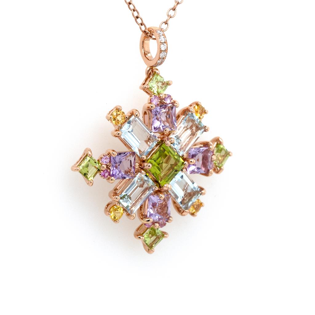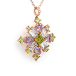 Pastel Geometric Pendant with peridot, aquamarine, amethyst, pink and yellow sapphires (4.89ctw) set in 18k rose gold with a diamond pave bail.