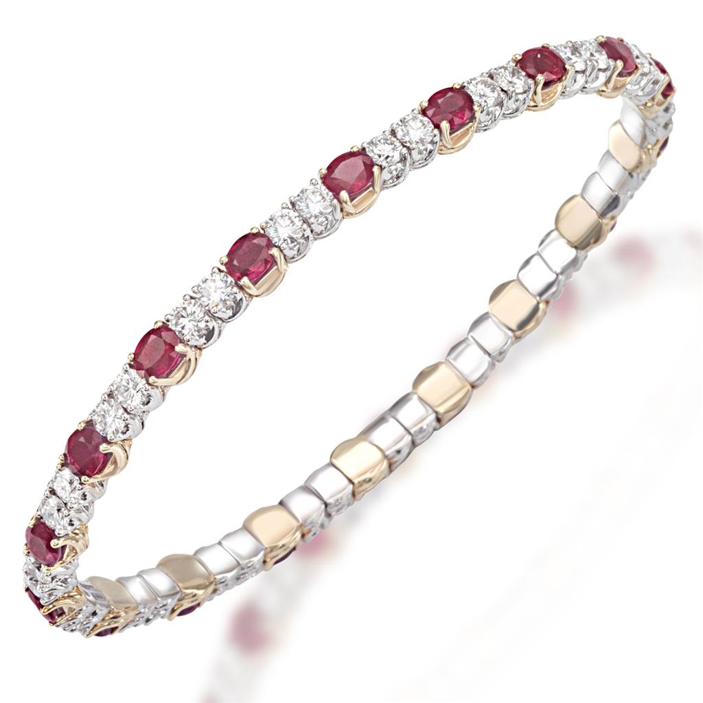 Picchiotti Xpandable ™ bracelet in 18 karat white gold with a repeating pattern of two prong set round brilliant cut diamonds alternating with a single prong set oval cut Burmese origin oval ruby. Diamonds total 34 at 4.07 total carat weight, F/G color VS clarity. Rubies total 17 at 5.68 total carat weight. Bracelet has a 55mm inner diameter when not expanded.