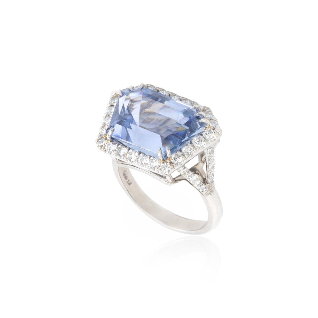 Diamond And Sapphire Ring With Center 14.16 Carat Hexalateral Shaped Violetish Blue Heat Treated Ceylon Sapphire With Agl Cert# Cs84724 Surrounded By A Halo Of U-Pave Set Diamonds That Continue 1/4 Of The Way Down The Shank, Diamonds Total 24 @ 0.96 Ctw, Ring Is Finger Size 7