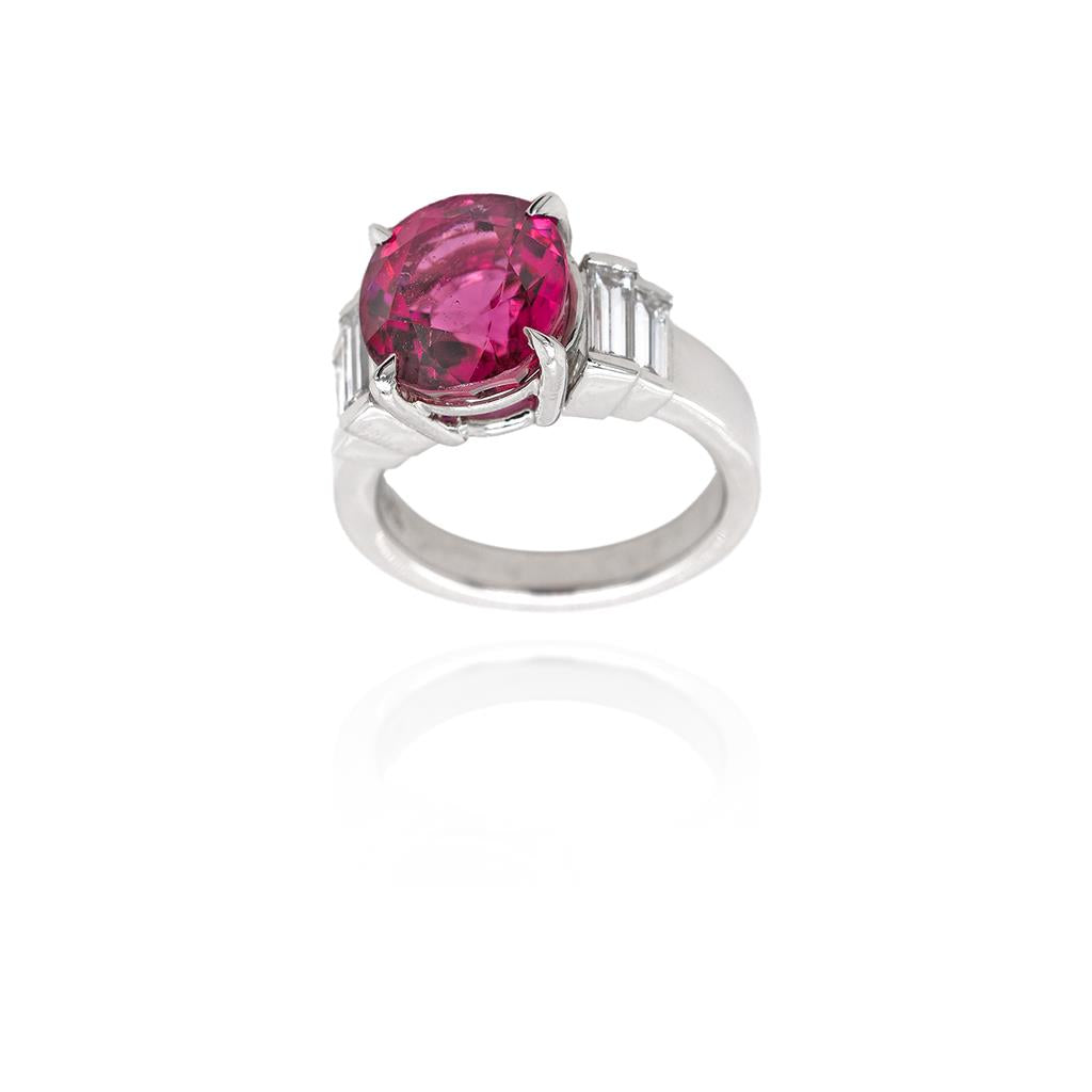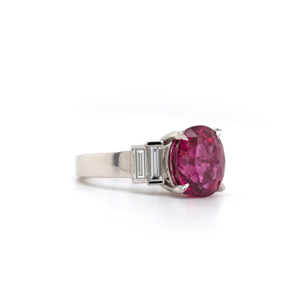 Oliver Smith platinum ring with a 6.17ct Red Tourmaline gemstone, set between two bar set graduating straight baguette cut diamonds on either side. Four diamonds at 0.80 total carats, VS clarity, F color, on square tapering shank.