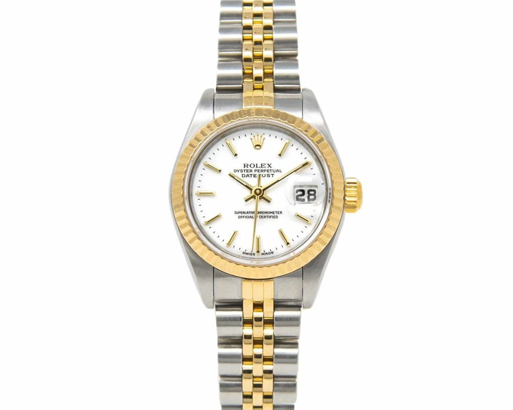 Case Size: 26mm Case Shape: Round Buckle: Integrated Materials: Stainless/18K Dial: White Indices: Stick Bezel: Fluted Case Back: Closed Movement: Automatic Complications: Hours, Minutes, Seconds, Date Strap: Jubilee Bracelet Reference #: 79173 With No Box or Papers