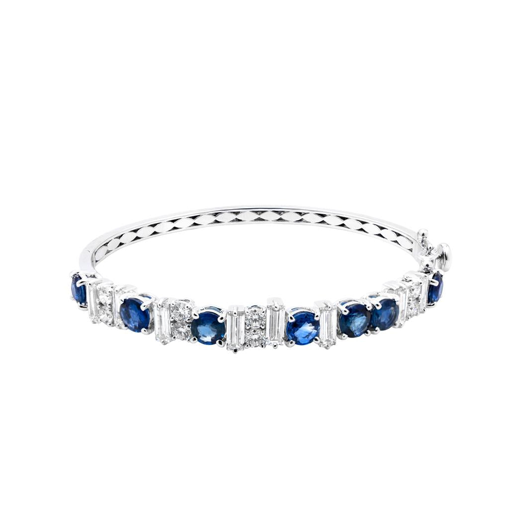Sapphire And Diamond Hinged Bangle With Twenty Four Natural Round Brilliant Cut And Baguette Diamonds (2.84Ctw, F/G, Vs1) And Seven Round Blue Sapphires (3.99Ctw) Prong Set In 18 Karat White Gold On The Top Half Of The Oval Bangle, Box Style Clasp With Two Figure Eight Safety Clasps.