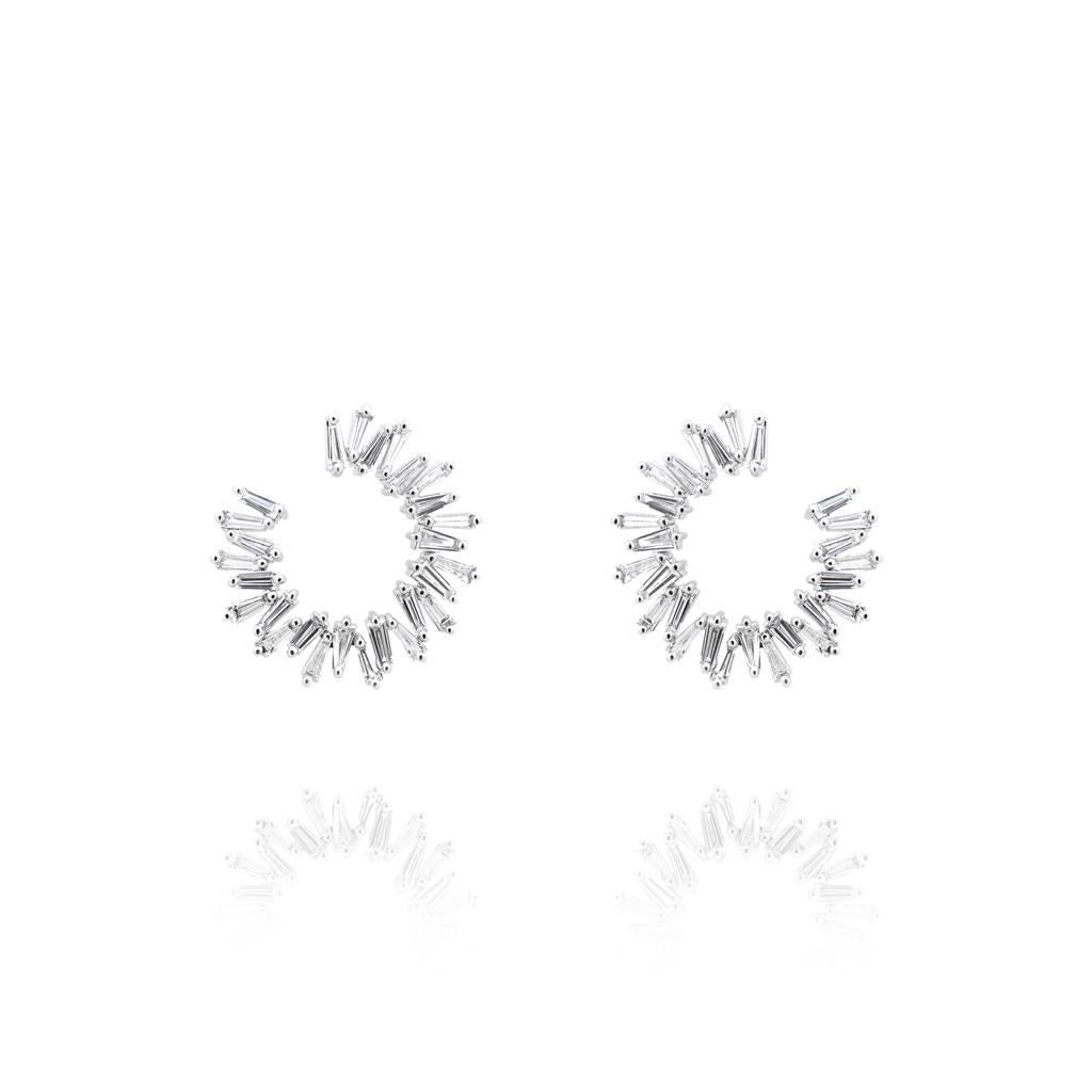 Oliver Smith 18 karat white gold Cairn collection earrings in the form of a circle of prong set straight baguette diamonds, 54 @ 2.01 ctw on post with friction backs
