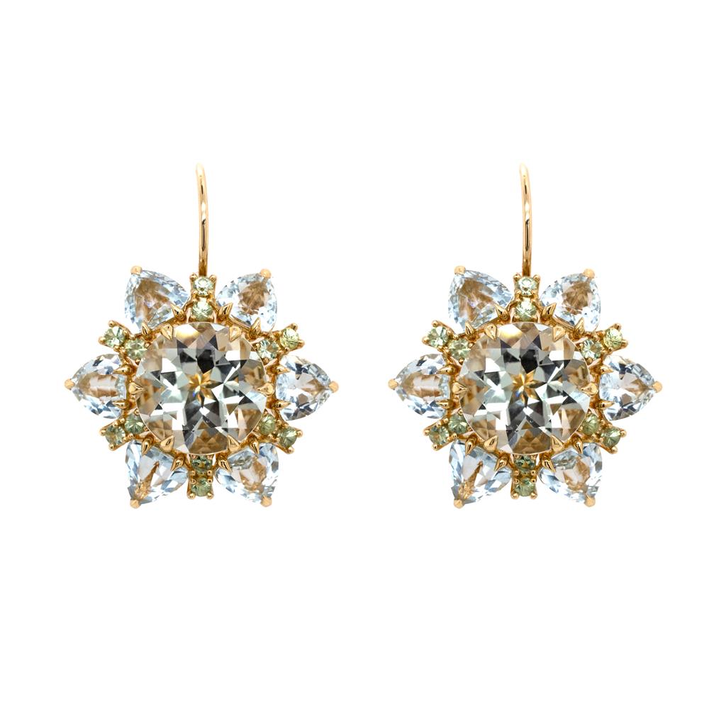 Statement Flower Earrings With Green Amethyst And Sapphires (18.75Ctw) Set In 18K Yellow Gold With A French Wire.