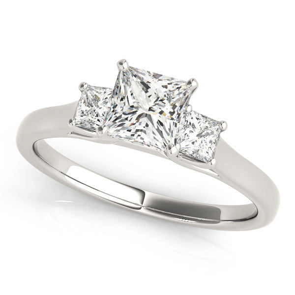A three-stone engagement ring beautifully combines different stone sizes, offering a timeless yet contemporary look.