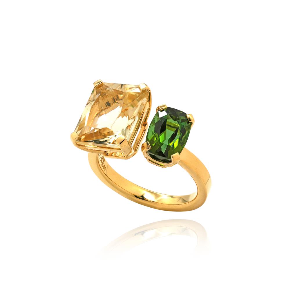 Toi et Moi Ring with one cushion cut checkerboard rhodolite (3.85cts) and one emerald cut citrine (22.84cts) prong set in 18 karat yellow gold, size 7